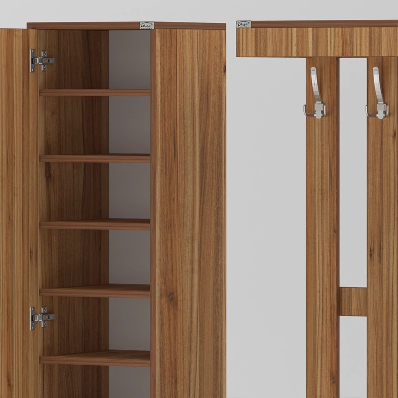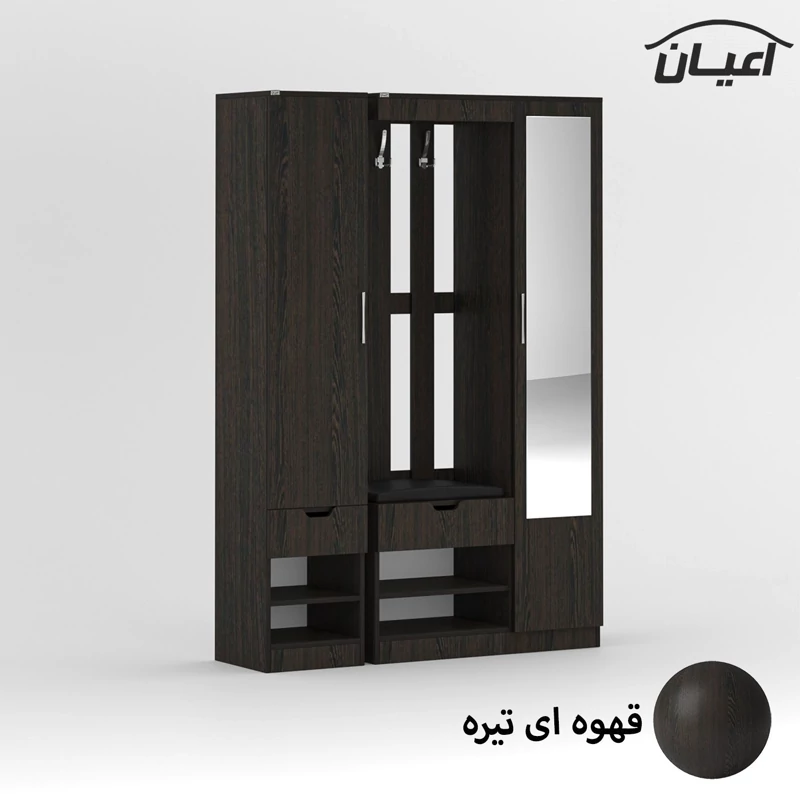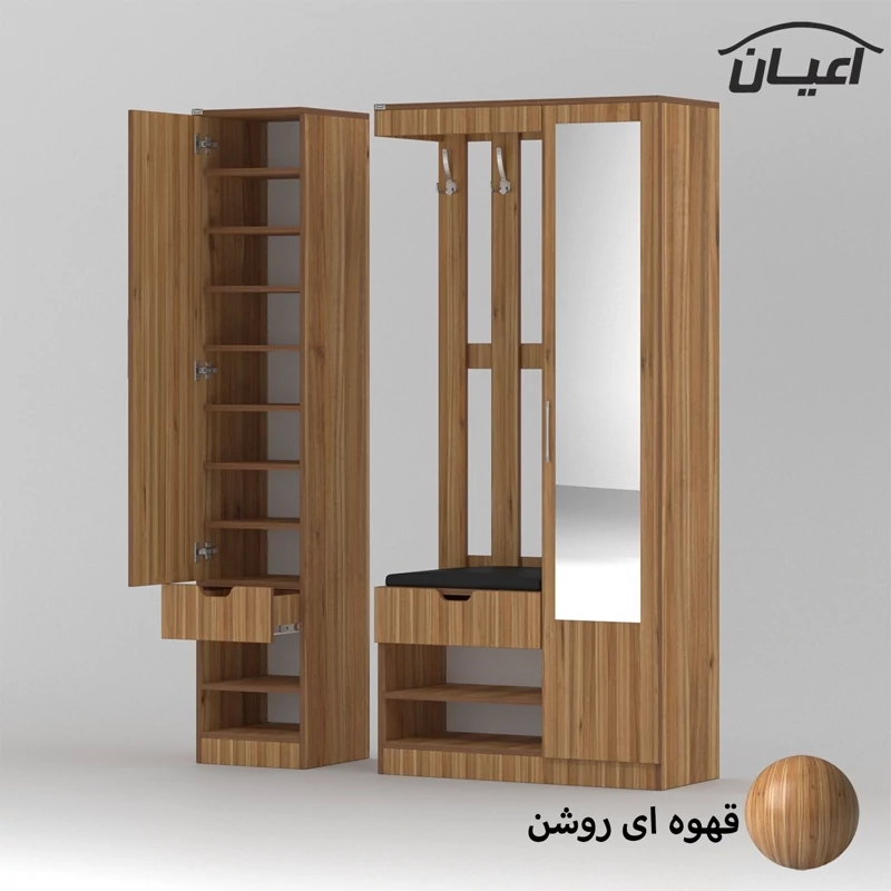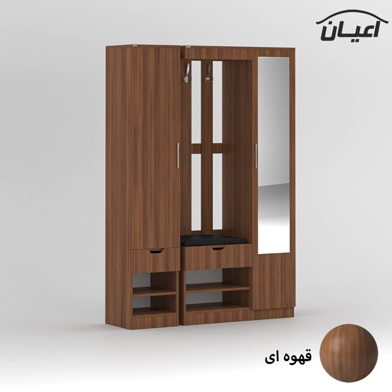جاکفشی اعیان.جنس ملامینه.سطح ضدخش.طراحی ساده و کاربردی.وزن متناسب با ابعاد.قابل استفاده در منزل و محل کار.دارای دو درب کمدی (یک سمت دارای ده طبقه و یازده فضا و سمت دیگر دارای هفت طبقه و هشت فضا جهت قرار دادن کفش می باشد) و دو کشو با ریل سه تکه ساچمه ای و دارای 4 فضای مجزا. و یک فضای نشیمن.تحمل وزن متناسب با ابعاد و به صورت استاندارد.ارسال به صورت مونتاژ شده و در بسته بندی دو آیتمی است، این کالا را فقط با برند و لوگو اعیان تهیه کنید ، این محصول در رنگ بندی ( سفید، طوسی، مشکی، قهوه ای روشن، قهوه ای(گردویی)، قهوه ای تیره(ونگه) و حالت چند رنگ (سفید ، قهوه ای) تولید و عرضه می شود ، لطفا توجه فرمایید که همواره چند درجه اختلاف رنگ بین تصاویر بارگذاری شده و کالای ساخته شده وجود دارد. همچنین برای کالای مشابه که دارای رگال لباس باشد میتوانید به کد FH383 مراجعه کنید.
