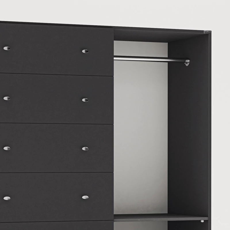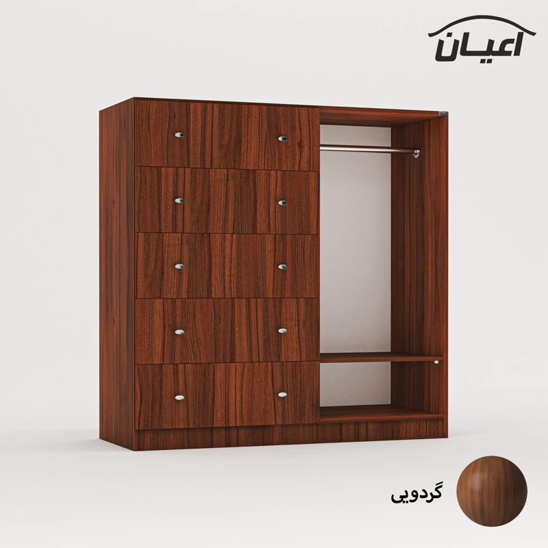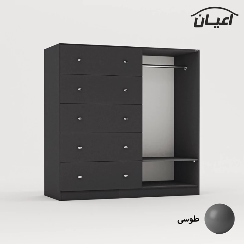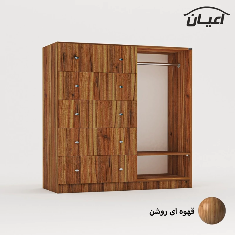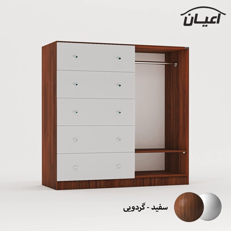 دراور اعیان - جنس نئوپان ملامینه شرکتی - سطح ضدخش - طراحی مدرن -دارای پنج کشو بازشو , رگال لباس و قفسه ی متحرک - بسته بندی با لوگو و برند اعیان.