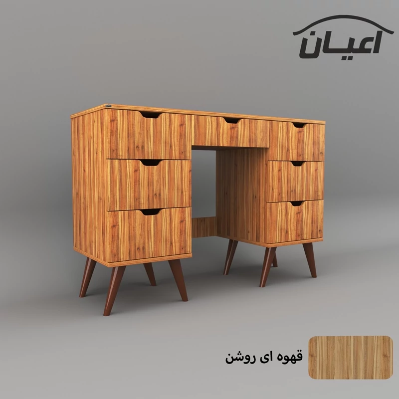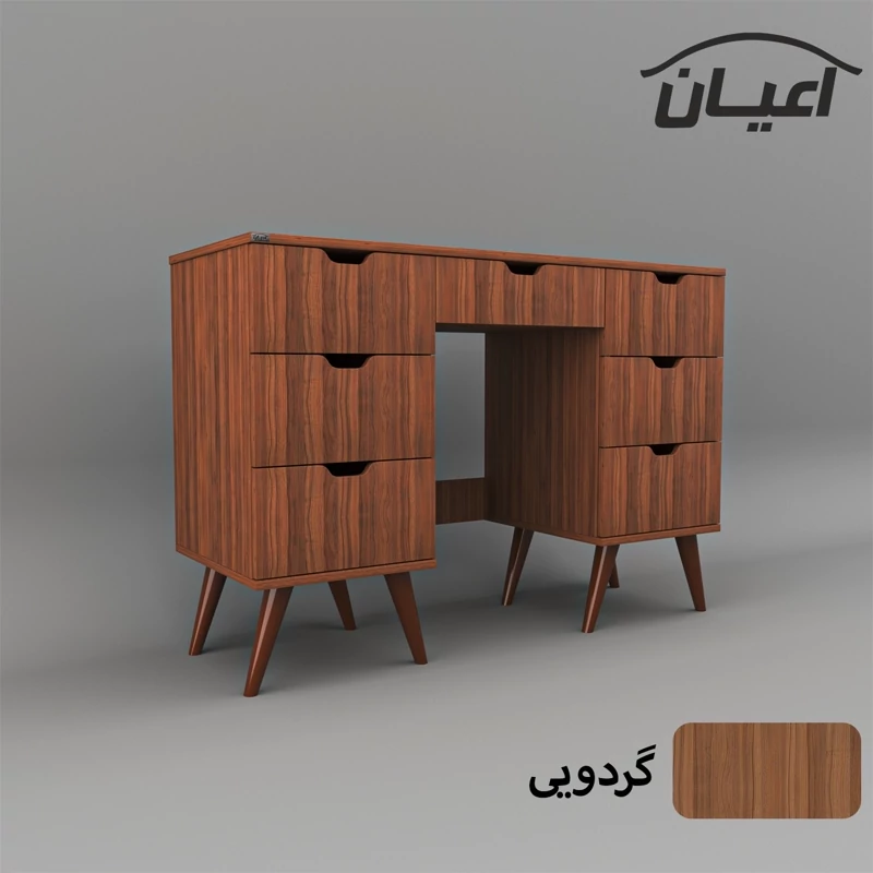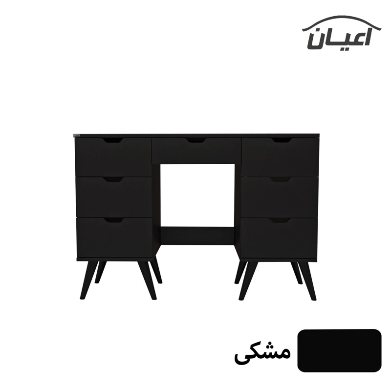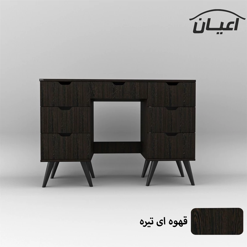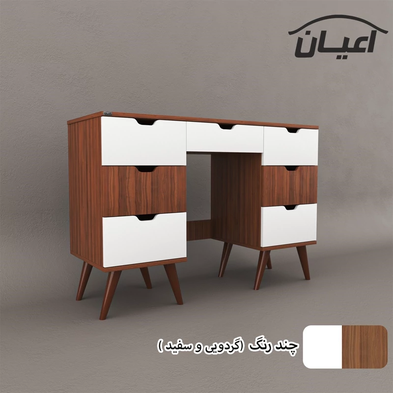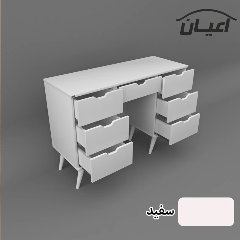 میز آرایش اعیان- جنس نئوپان ملامینه شرکتی-دارای هفت کشو-دستگیره ها به صورت سی ان سی-دارای پایه پلی اورتان(مخروطی) رنگ بندی کالا در آلبوم قابل مشاهده است(در رنگ های سفید/مشکی/قهوه ای/قهوه ای روشن/قهوه ای تیره (ونگه)و چند رنگ (قهوه ای و سفید)تولید می شود) جنس نئوپان ملامینه شرکتی کالا به صورت مونتاژ شده و به صورت تک آیتمی است. ریل سه تکه