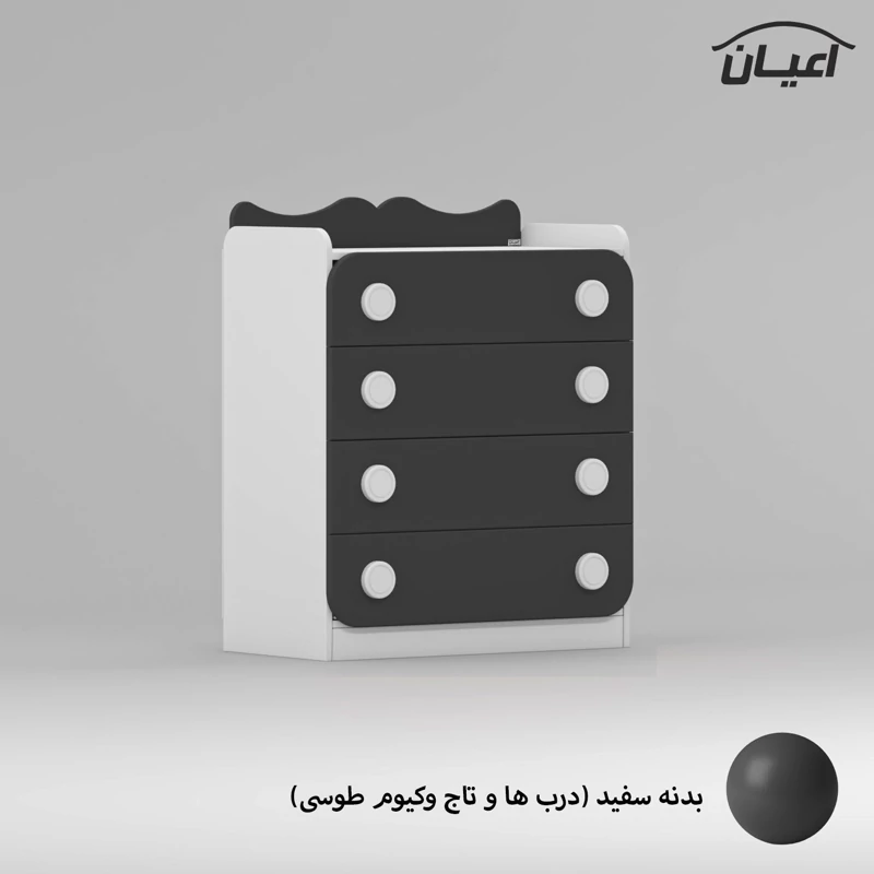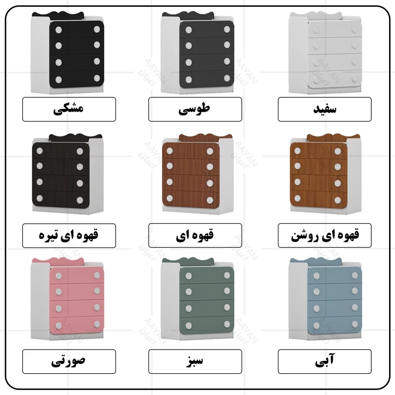 دراور کودک اعیان ، جنس بدنه مغزی نئوپان با روکش ملامینه ، جنس درب های کشو و پشتبند و دستگیره ها مغزی ام دی اف با روکش وکیوم ، دارای چهار کشو با بازشوی ریل سه تکه ساچمه ای ، ، این کالا در رنگ بندی (سفید ، طوسی ، مشکی ، قهوه ای روشن ، قهوه ای (گردویی) ، قهوه ای تیره (ونگه) ، آبی ، صورتی و سبز) تولید و عرضه می گردد ، لطفا دقت نمایید که در تمامی رنگ ها بدنه ی اصلی کالا و دستگیره ها سفید می باشد و معیار انتخاب رنگ ، رنگ درب کشوهای کار می باشد، توجه فرمایید که همواره چند درجه اختلاف رنگ بین تصاویر بارگزاری شده و کالای ساخته شده وجود دارد.برای انتخاب تخت خواب ست همین دراور کد FH890 و برای انتخاب کمد لباس ست همین دراور کد FH891 را جست و جو و انتخاب کنید