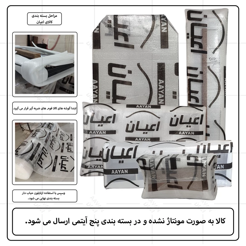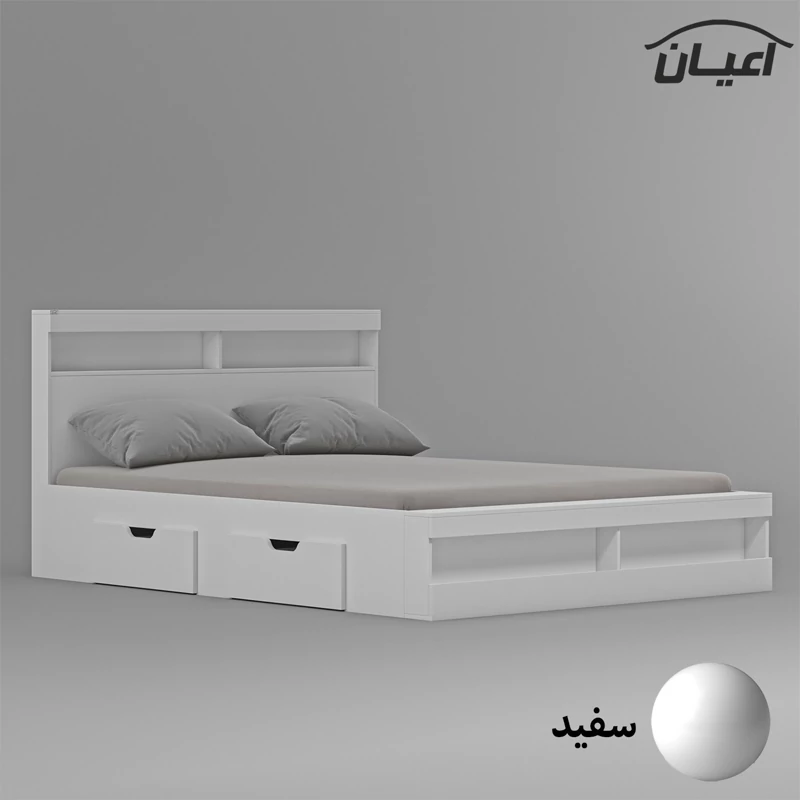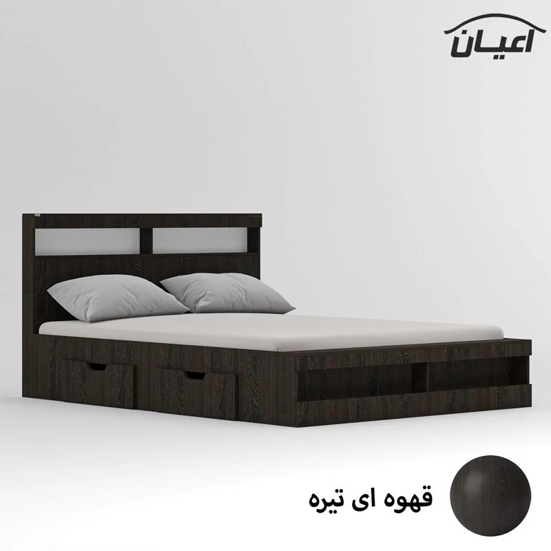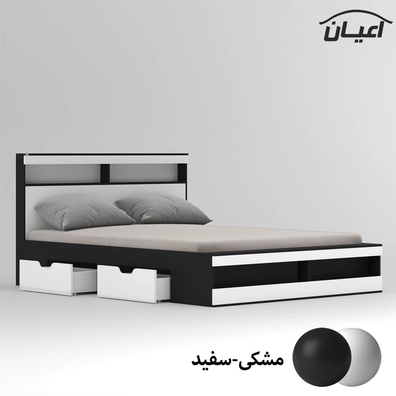 تخت خواب دونفره اعیان-جنس مغزی نئوپان با روکش ملامینه شرکتی-کالا دارای یک باکس در قسمت کلگی بالا و دو فضا و یک باکس قسمت کلگی پایین و دو فضا است-دارای دو کشو چرخدار-کشو ها امکان جابجایی به طرفین را دارد-دستگیره کشو ها به صورت سی ان سی منحنی می باشد-کالا فاقد تشک می باشد-جنس کفی کالا نئوپان خام است-کالا به صورت مونتاژ نشده و در بسته بندی 5آیتمی ارسال می شود-رنگبندی کالا:سفید/مشکی/قهوه ای(گردویی)/قهوه ای روشن/قهوه ای تیره/طوسی/چند رنگ(مشکی-سفید)-رنگ بندی کالا در آلبوم قابل مشاهده است.