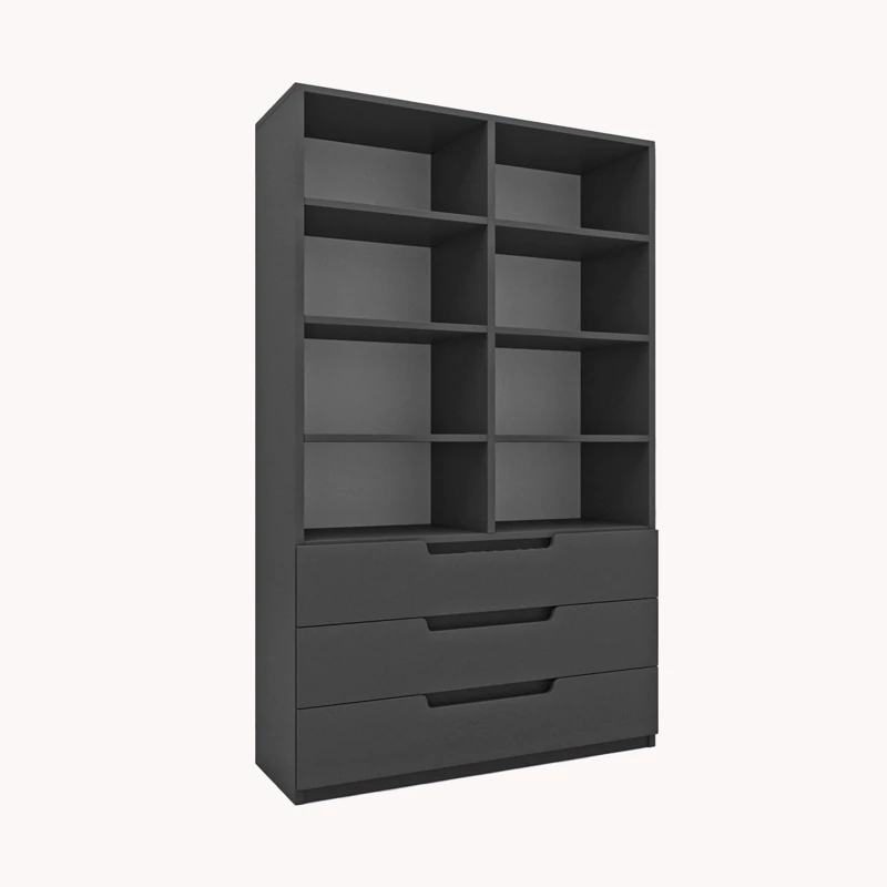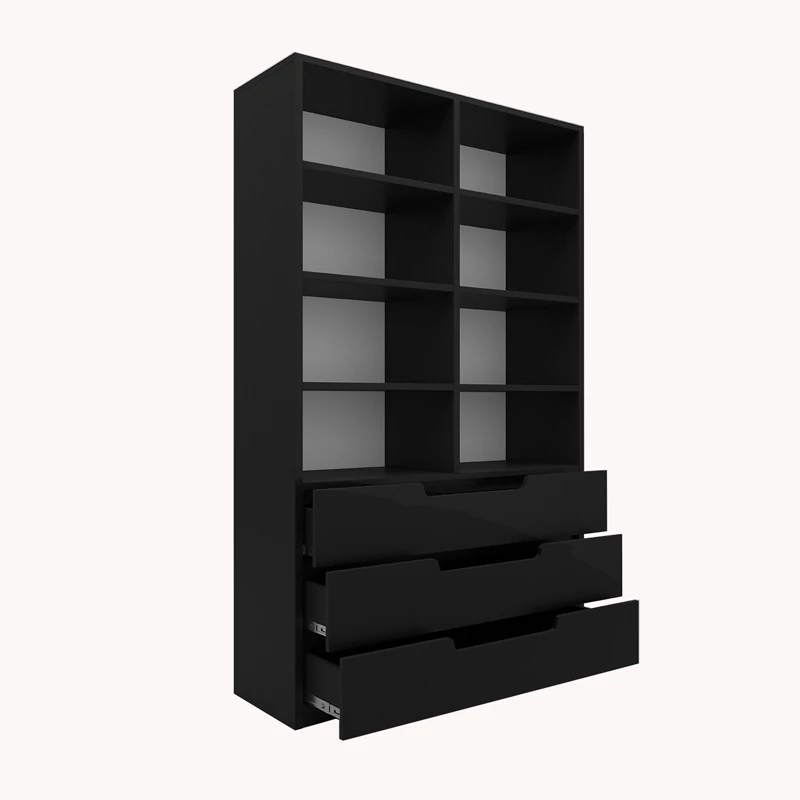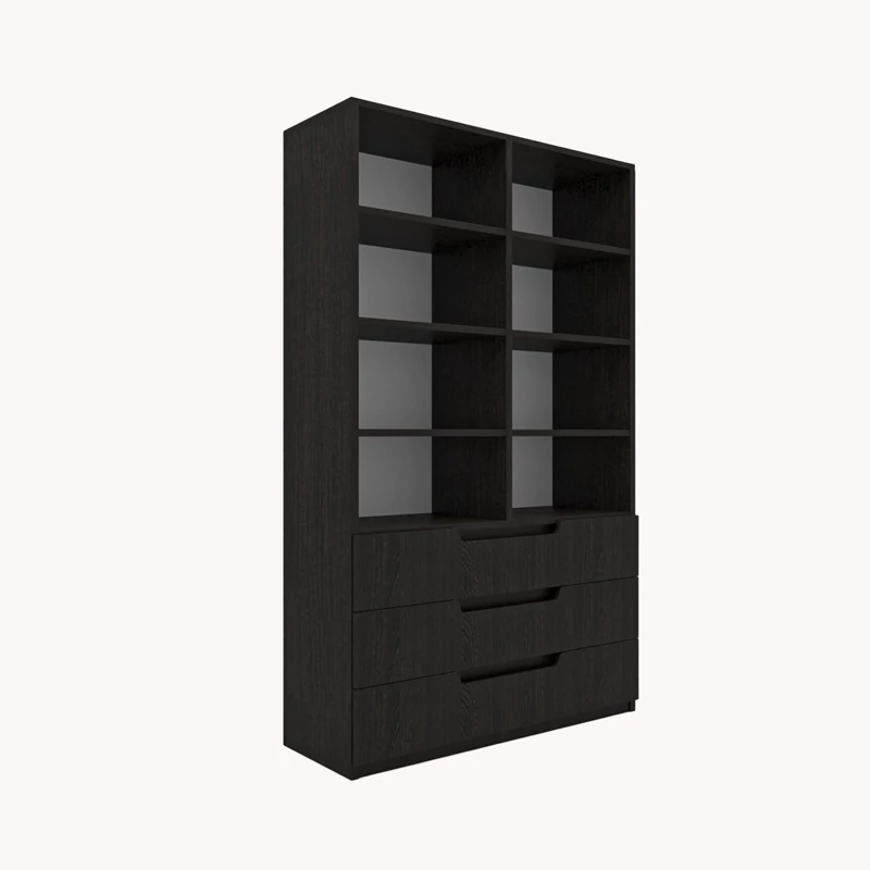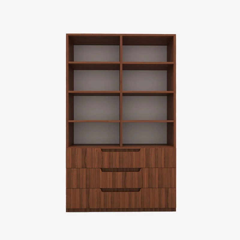 کتابخانه اعیان-جنس مغزی نئوپان با روکش ملامینه شرکتی-طراحی مدرن و کاربردی-دارای سه کشو با ریل سه تکه -دارای هشت فضای مجزا جهت استفاده کتابخانه و یا فضای دکوری است.