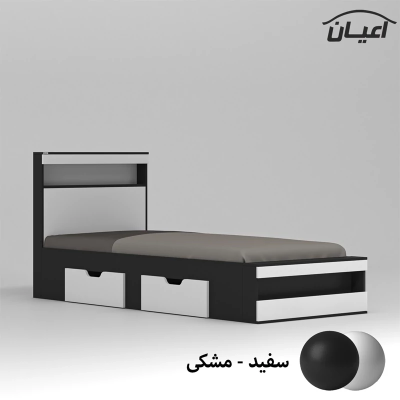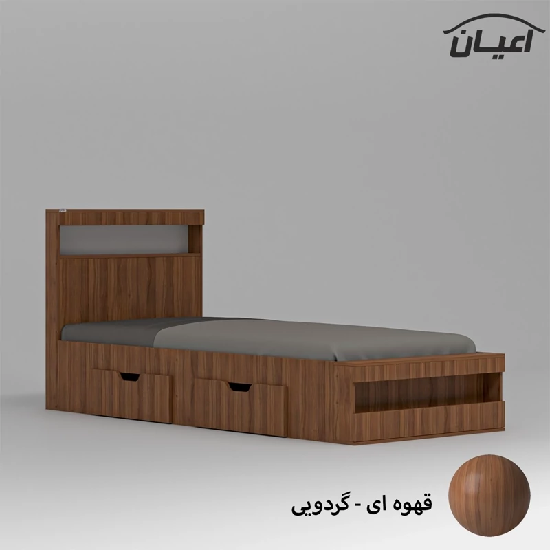 تخت خواب یکنفره اعیان-جنس مغزی نئوپان با روکش ملامینه شرکتی-کالا دارای یک باکس در قسمت کلگی بالا و یک باکس قسمت کلگی پایین است-دارای دو کشو چرخدار-کشو ها امکان جابجایی به طرفین را دارد-دستگیره کشو ها به صورت سی ان سی منحنی می باشد-کالا فاقد تشک می باشد(سایز تشک مناسب 200×90 سانتیمتر است)