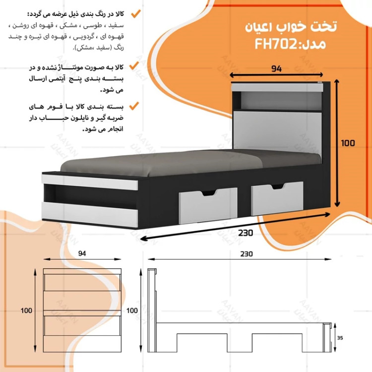 تخت خواب یکنفره اعیان مدل FH702 سایز 90x200 سانتی متر ( ارسال با باربری - هزینه ارسال پس کرایه)