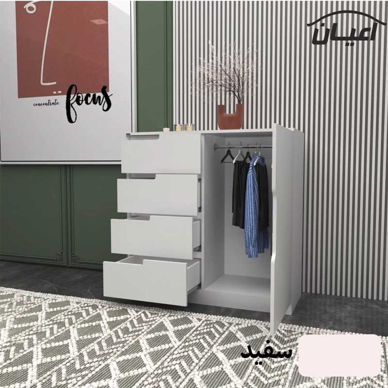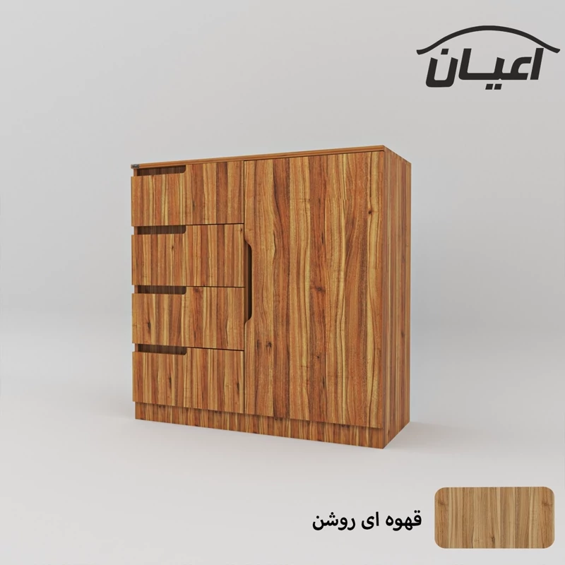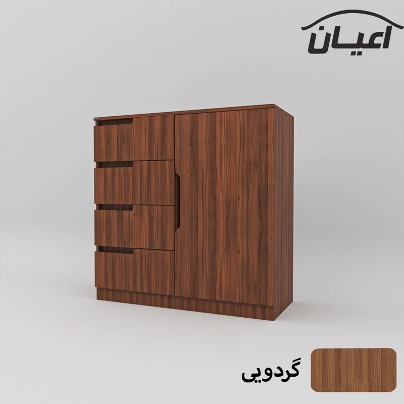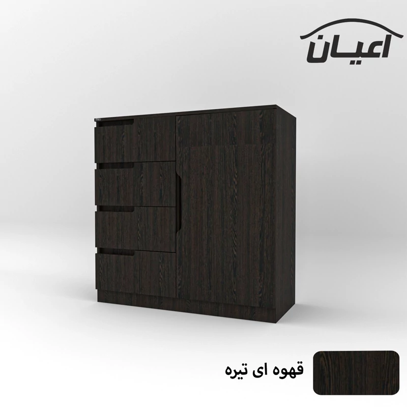 دراور چند منظوره اعیان - جنس نئوپان ملامینه شرکتی - سطح ضدخش - طراحی ساده و کاربردی -دارای چهار کشو بازشو و یک درب کمدی دارای فضای مجزا میله رگال-دستگیره به صورت سی ان سی