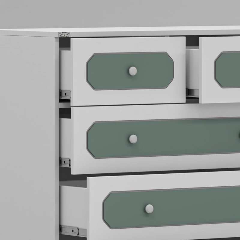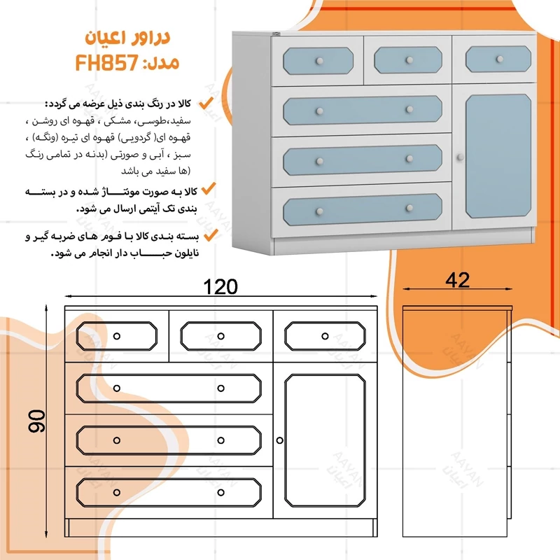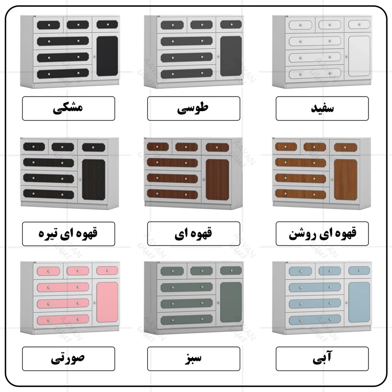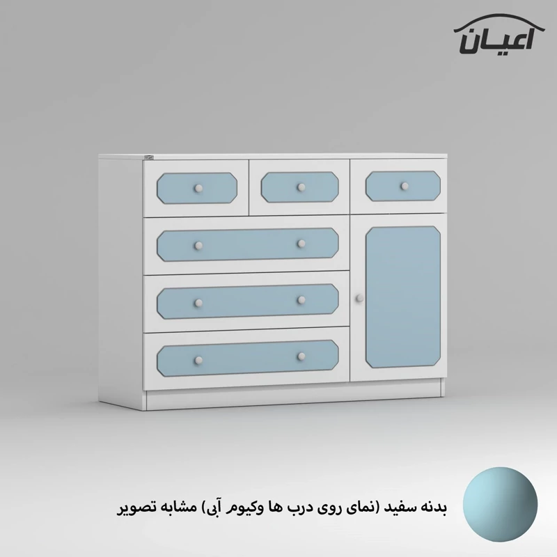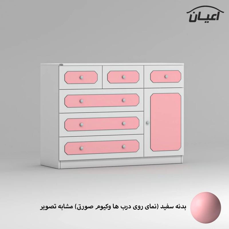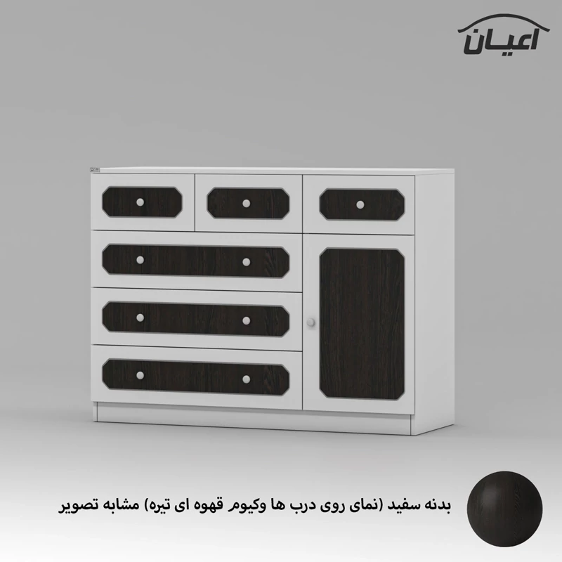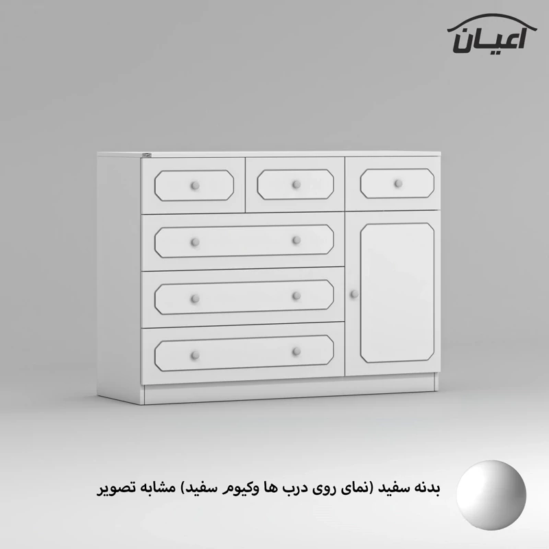 دراور اعیان ، جنس بدنه : مغزی نئوپان با روکش ملامینه ، جنس درب ها مغزی ام دی اف با روکش وکیوم ، بر روی درب ها نمای سه میل با وکیوم رنگی کار شده است ، دارای شش کشو (سه کشوی بزرگ و سه کشوی کوچک) با بازشوی ریل سه تکه ساچمه ای و یک درب کمدی با بازشوی لولای آرام بند ، دستگیره توپی سفید ، این کالا در رنگ بندی (سفید ، طوسی ، مشکی ، قهوه ای روشن ، قهوه ای (گردویی) ، قهوه ای تیره (ونگه) ، آبی ، صورتی و سبز) تولید و عرضه می گردد، بدنه ی کالا در تمامی رنگ ها سفید می باشد و معیار انتخاب رنگ ، رنگ نمای روی درب ها می باشد ، این کالا را فقط با برند و لوگوی اعیان تهیه کنید ، لطفا توجه فرمایید که همواره چند درجه اختلاف رنگ بین تصاویر بارگزاری شده و کالا وجود دارد.