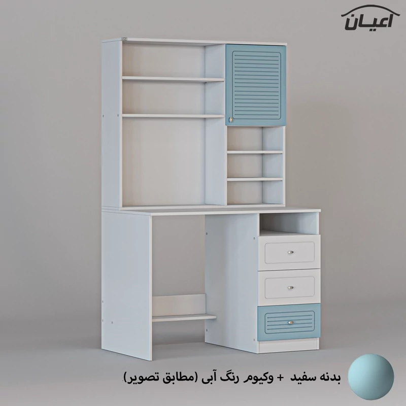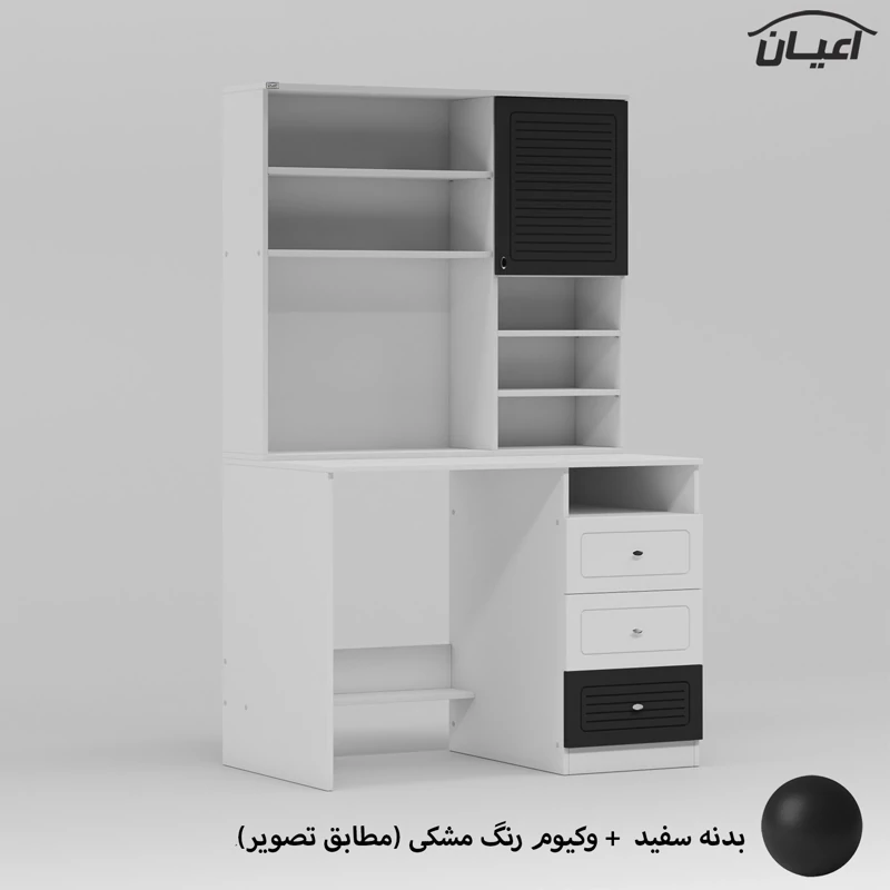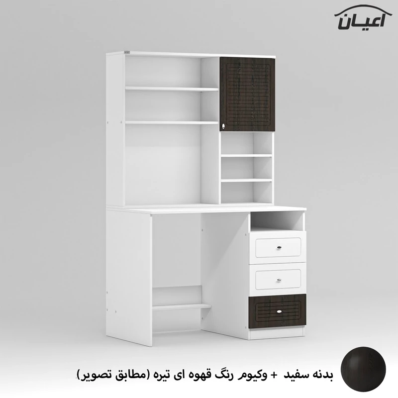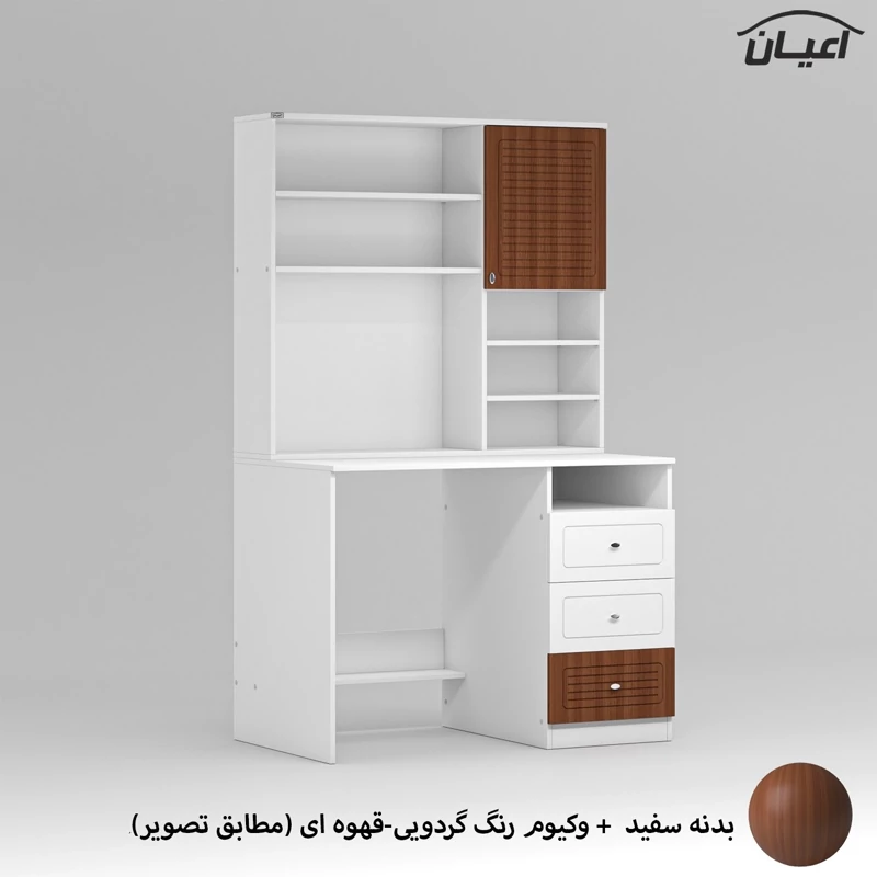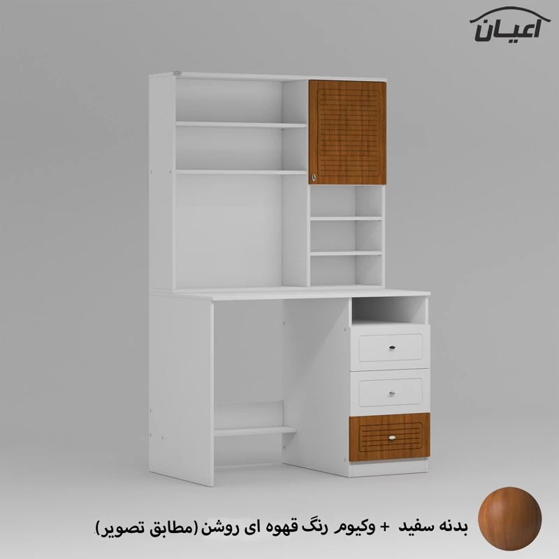 میز تحریر اعیان-جنس بدنه مغزی نئوپان با روکش ملامینه-جنس درب ها مغزی ام دی اف با روکش وکیوم-میز دارای سه کشو با ریل سه تکه-دارای کتابخانه شامل چهار طبقه و شش فضا مجز دارای درب کمدی-درب به صورت آرام بند-کالا به صورت مونتاژ شده و در بسته بندی دو آیتمی ارسال می شود