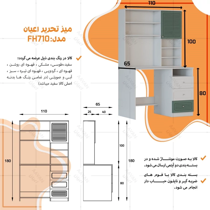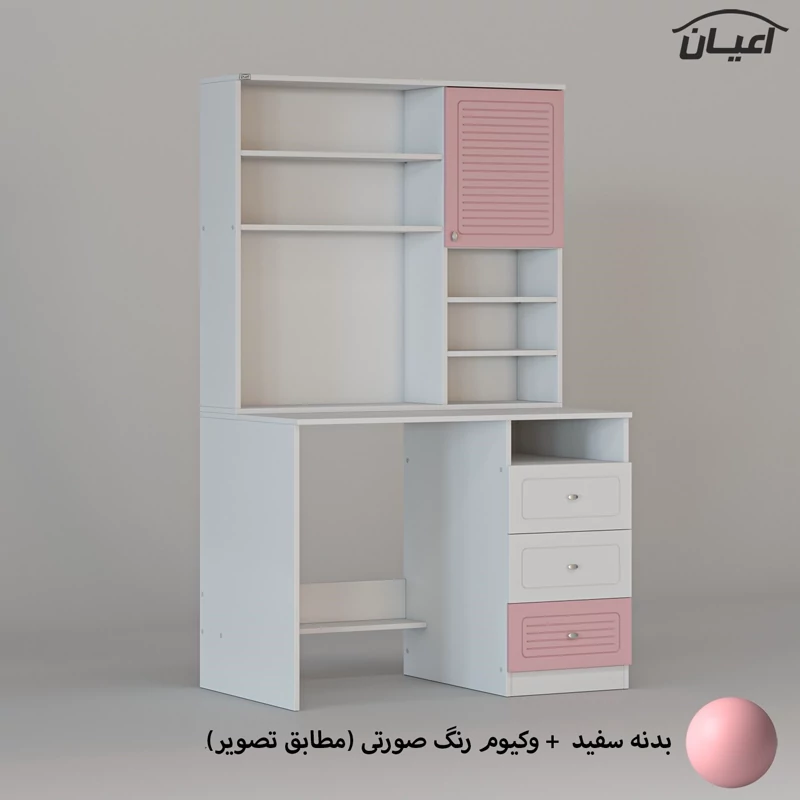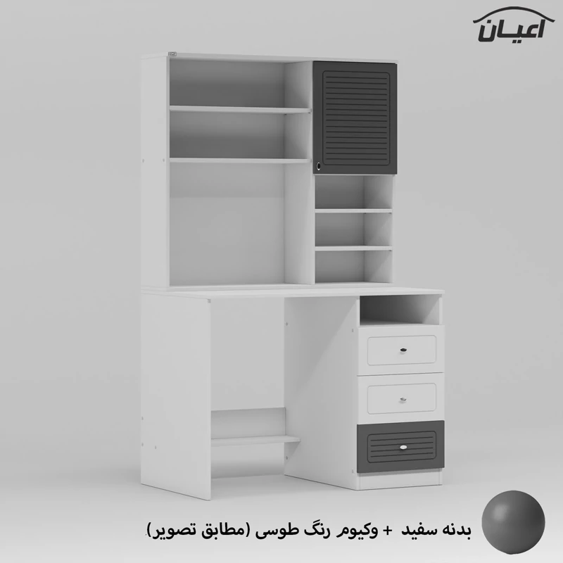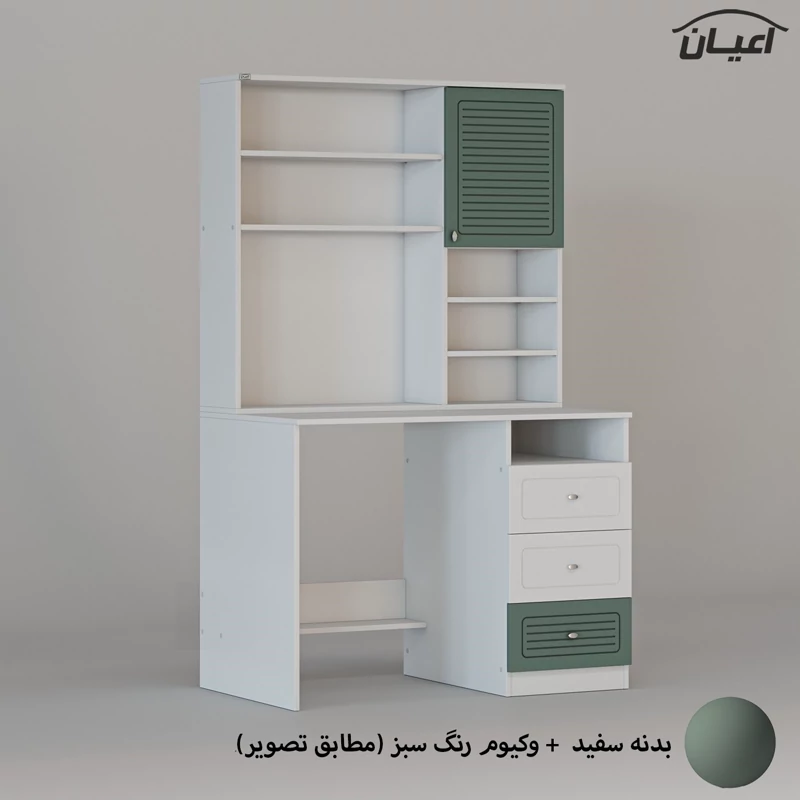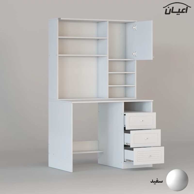 میز تحریر اعیان-جنس بدنه مغزی نئوپان با روکش ملامینه-جنس درب ها مغزی ام دی اف با روکش وکیوم-میز دارای سه کشو با ریل سه تکه-دارای کتابخانه شامل چهار طبقه و شش فضا مجز دارای درب کمدی-درب به صورت آرام بند-کالا به صورت مونتاژ شده و در بسته بندی دو آیتمی ارسال می شود