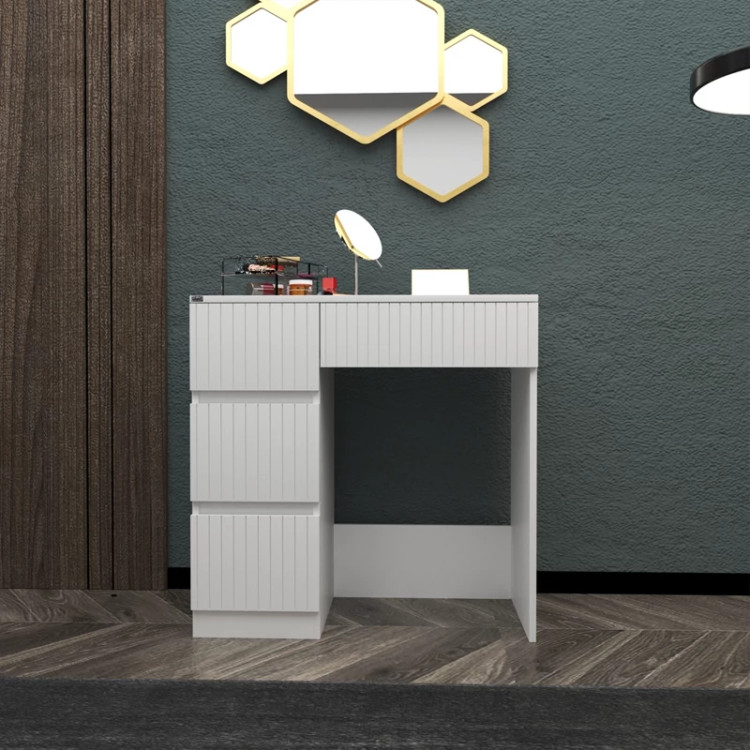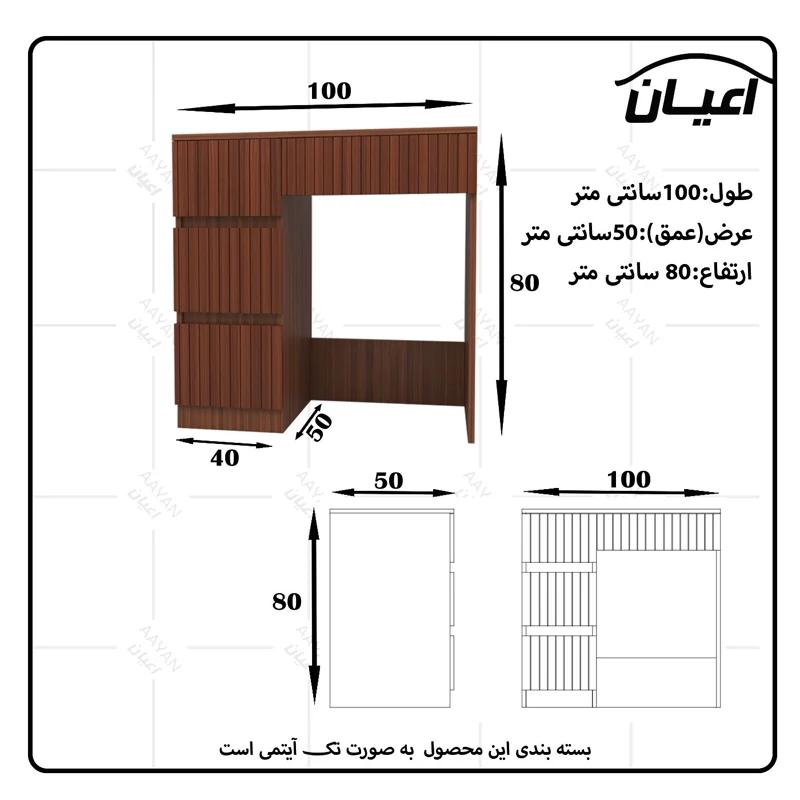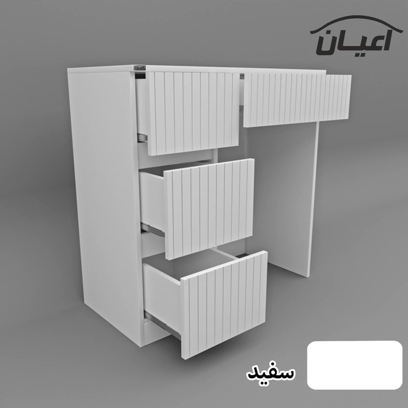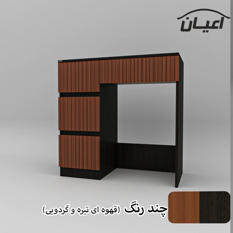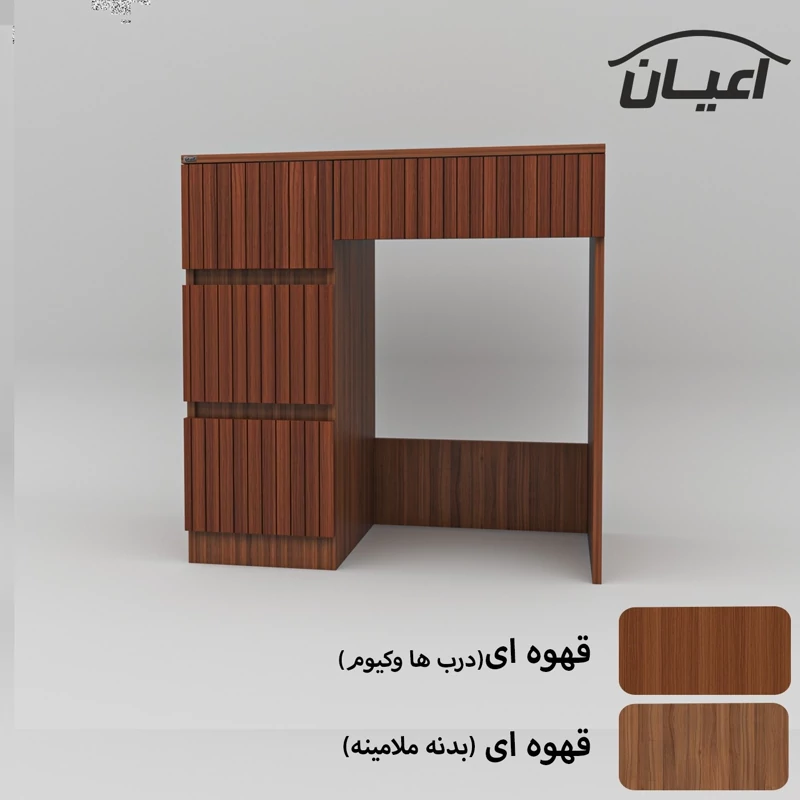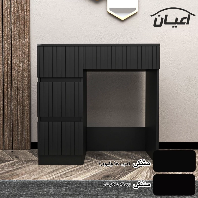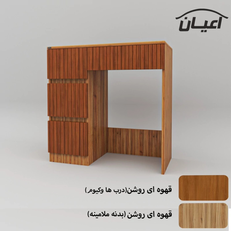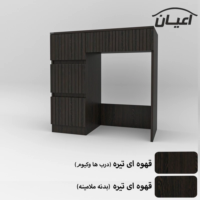 میز آرایش اعیان- جنس نئوپان ملامینه و وکیوم (مغذی ام دی اف با روکش وکیوم)شرکتی-دارای چهار کشو -دستگیره مخفی. رنگ بندی کالا در آلبوم قابل مشاهده است(در رنگ های سفید/مشکی/قهوه ای/قهوه ای روشن/قهوه ای تیره (ونگه)و چند رنگ (قهوه ای تیره و گردویی)تولید می شود) - بسته بندی کالا تنها با لوگو و برند اعیان-