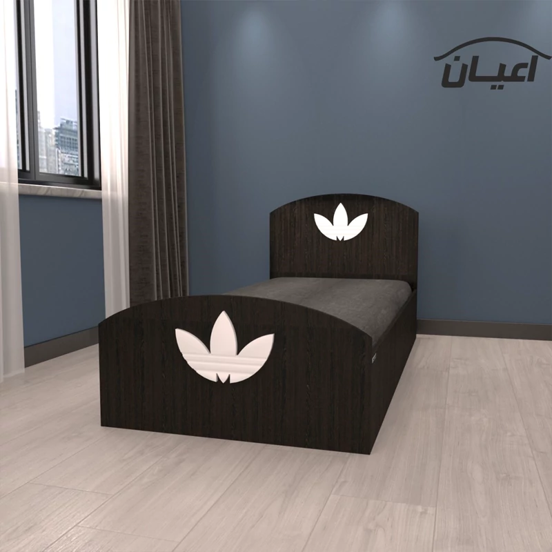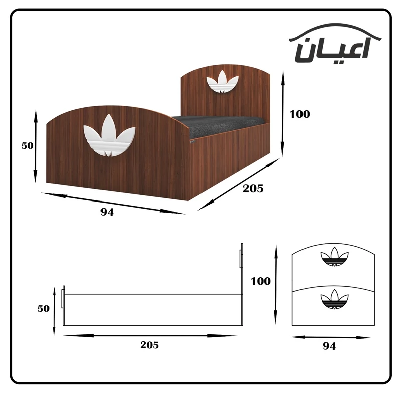 تخت خواب یک نفره اعیان طرح آدیداس.جنس ملامینه شرکتی.جنس لوگو آدیداس وکیوم می باشد در رنگبندی متنوع و در ابعاد استاندارد.کالا فاقد تشک می باشد جهت تهیه تشک،سایز استاندارد 200×90 سانت مناسب است.جنس کفی تخت نئوپان خام و به صورت دوتکه بوده که همراه با چند جفت فاق و زبانه به عنوان پایه در بسته بندی جداگانه ارسال می شود.این محصول به صورت مونتاژ نشده در سه بسته بندی همراه با بروشور راهنمای نصب با لوگو و برند اعیان ارسال می شود. این کالا در رنگ های سفید/مشکی/قهوه ای/قهوه ای روشن/قهوه ای تیره(ونگه) و حالت چند رنگ که مشابه تصاویر آلبوم محصول تولید می شود .