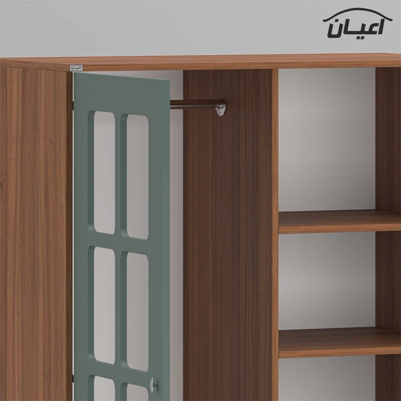 کمد لباس اعیان ، جنس بدنه مغزی نئوپان با روکش ملامینه ، جنس درب ها مغزی ام دی اف با روکش وکیوم، دارای دو کشو با بازشوی ریل سه تکه ساچمه ای ، دارای دو درب کمدی با بازشوی لولای آرام بند و طراحی CNC روی درب ها ، پشت درب ها شیشه به ابعاد 38*115 کار شده است ، دارای سه طبقه و چهارفضا جهت قرار دادن (کیف ، کفش ، اکسسوری و...) و یک رگال لباس ، این کالا را فقط با لوگو و برند اعیان تهیه کنید ، این کالا در رنگ بندی :(سفید ، طوسی ، مشکی ، قهوه ای روشن ، قهوه ای (گردویی) ، قهوه ای تیره (ونگه یا قهوه ای سوخته) و حالت چند رنگ (قهوه ای ، سبز) تولید و عرضه می گردد ، لطفا توجه داشته باشید که همواره چند درجه اختلاف رنگ بین تصاویر بارگذاری شده و کالا وجود دارد.