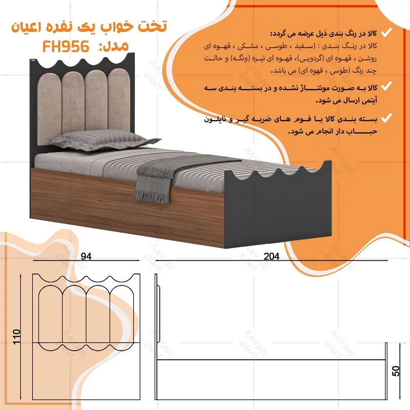تخت خواب ام دی اف یک نفره اعیان مدل FH956 سایز 90x200 سانتی متر (پس کرایه)
