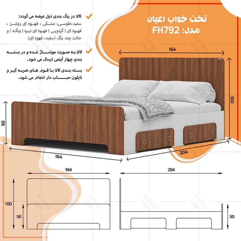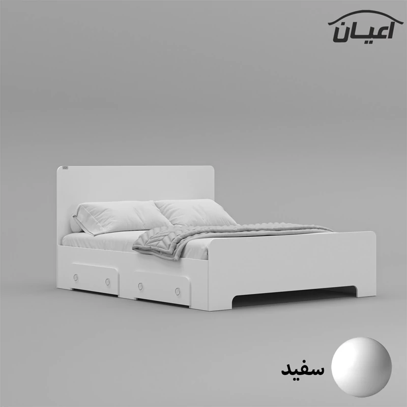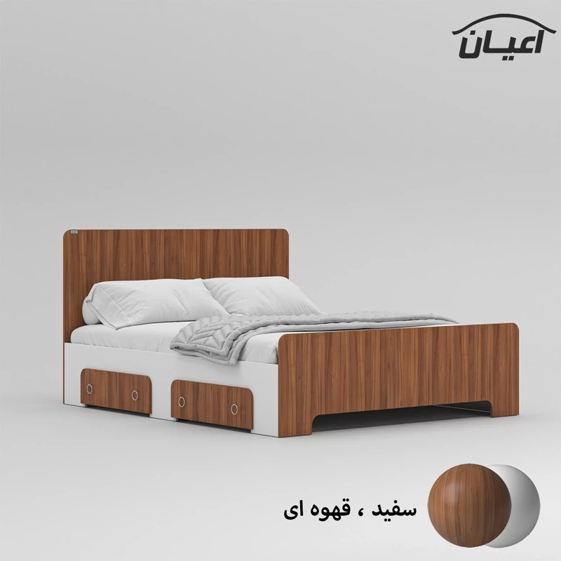 تخت خواب دو نفره اعیان ، جنس نئوپان با روکش ملامینه، طراحی ساده، شیک و کلگی و بخش های مختلف دارای طراحی CNC منحنی ، دارای دو کشو با چرخ چمدانی (ساکی) ، کالا فاقد تشک می باشد، کفی به صورت سه تکه به همراه چند جفت پایه متحرک است، سایز تشک مناسب برای تخت خواب(200×160 سانتی متر) می باشد ، این کالا با رنگ بندی (سفید ، طوسی ، مشکی ، قهوه ای روشن ، قهوه ای (گردویی) ، قهوه ای تیره (ونگه) و حالت چند رنگ (سفید ، قهوه ای) تولید و عرضه می شود ، این کالا را فقط با لوگو و برند اعیان تهیه کنید، لطفا توجه داشته باشید که همواره چند درجه اختلاف رنگ بین تصاویر بارگذاری شده و کالای ساخته شده وجود دارد.