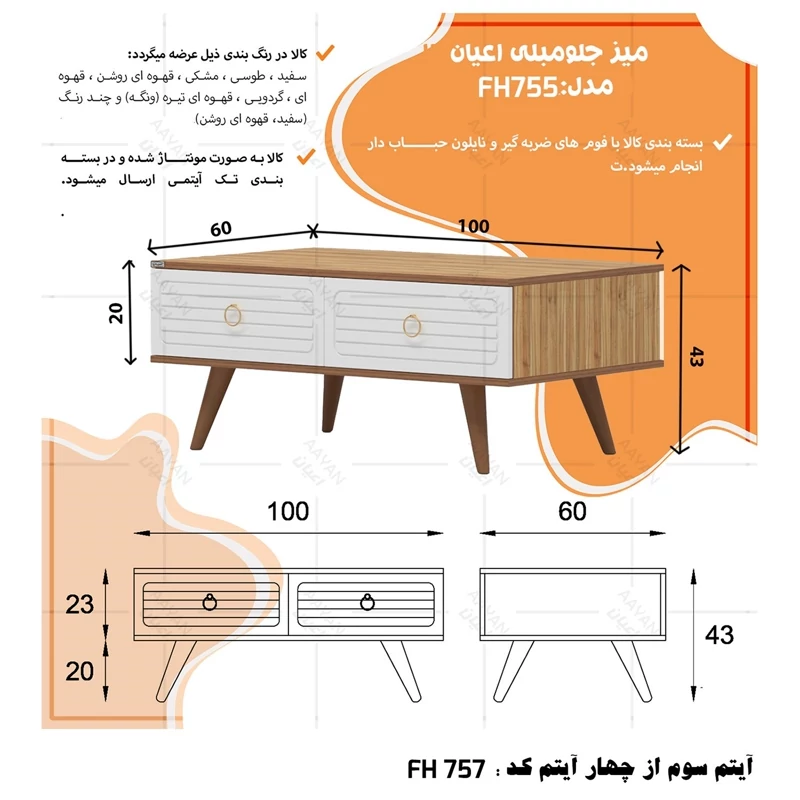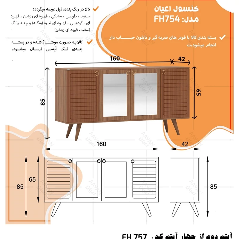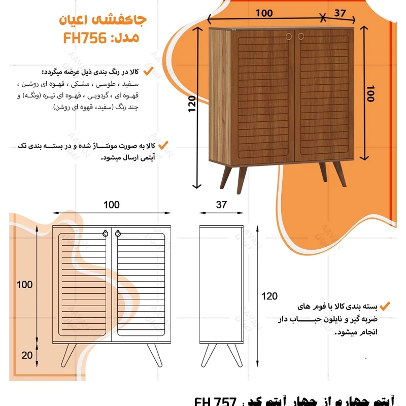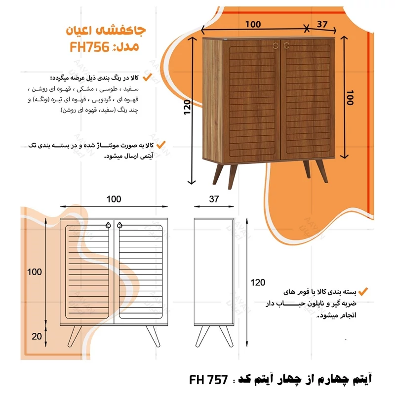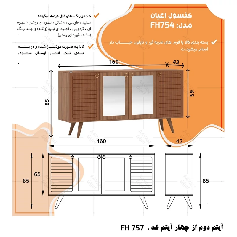 ست میز پذیرایی اعیان مدل FH757 مجموعه چهار عددی آیتم اول : میز تلویزیون اعیان ، جنس بدنه مغزی نئوپان با روکش ملامینه ، جنس درب ها مغزی ام دی اف با روکش وکیوم ، دارای یک طبقه و دو قفسه ، دارای دو درب کمدی با باز شوی لولا آرام بند ، دارای پایه مخروطی 20سانتی متری از جنس پلی اورتان، این کالا را فقط با لوگو و برند اعیان تهیه کنید ، این کالا در رنگ بندی (سفید ، طوسی ، مشکی ، قهوه ای روشن ، قهوه ای (گردویی) ، قهوه ای تیره (ونگه) و حالت چند رنگ (سفید ، قهوه ای روشن) ) تهیه و تولید می شود. لطفا توجه داشته باشید که همواره چند درجه اختلاف رنگ بین تصاویر بارگذاری شده و کالای ساخته شده وجود دارد. آیتم دوم : میز کنسول اعیان ، جنس بدنه مغزی نئوپان با روکش ملامینه ، جنس درب های طرح دار (CNC) مغزی ام دی اف با روکش وکیوم ، دارای دو طبقه و سه قفسه ، دارای چهار درب کمدی با باز شوی لولا آرام بند ، این کالا را فقط با لوگو و برند اعیان تهیه کنید . لطفا توجه داشته باشید که همواره چند درجه اختلاف رنگ بین تصاویر بارگذاری شده و کالای ساخته شده وجود دارد. آیتم سوم : میز جلو مبلی اعیان ، جنس بدنه : مغزی نئوپان با روکش ملامینه ، جنس درب های طرح دار (CNC) مغزی ام دی اف با روکش وکیوم ، دارای چهار کشو با ریل سه تکه ساچمه ای (استیل) ، پایه های مخروطی 20سانتی ، این کالا را فقط با لوگو و برند اعیان تهیه کنید . لطفا توجه داشته باشید که همواره چند درجه اختلاف رنگ بین تصاویر بارگذاری شده و کالای ساخته شده وجود دارد. آیتم چهارم : جاکفشی اعیان، جنس بدنه : مغزی نئوپان با روکش ملامینه ، جنس درب های طرح دار (CNC) مغزی ام دی اف با روکش وکیوم ، دارای چهار طبقه و پنج قفسه ، دارای پایه های مخروطی 20سانتی متری ، دارای دستگیره گوشواره ای طلایی، درب ها به صورت آرام بند است و کالا به صورت مونتاژ شده ارسال می گردد. این کالا را فقط با لوگو و برند اعیان تهیه کنید ، این کالا در رنگ بندی (سفید ، طوسی ، مشکی ، قهوه ای روشن ، قهوه ای (گردویی) ، قهوه ای تیره (ونگه) و حالت چند رنگ (سفید ، قهوه ای روشن) ) تولید می شود. لطفا توجه داشته باشید که همواره چند درجه اختلاف رنگ بین تصاویر بارگذاری شده و کالای ساخته شده وجود دارد.