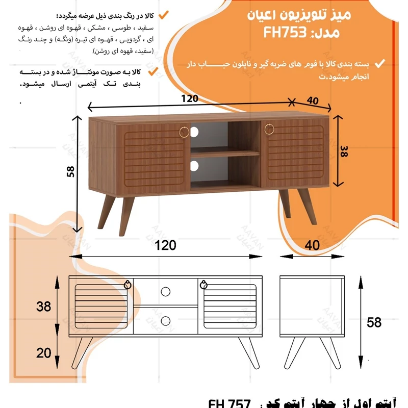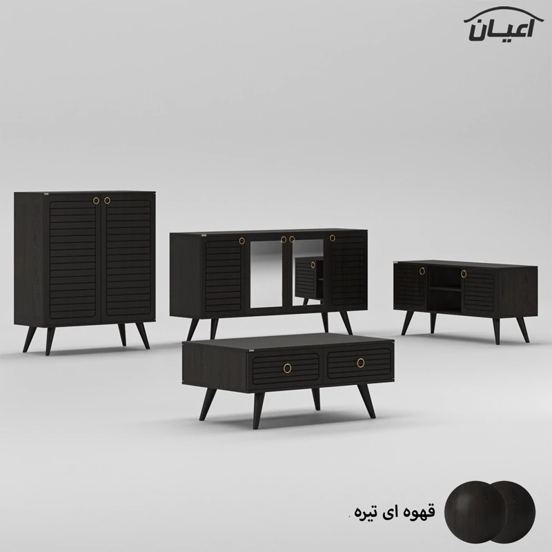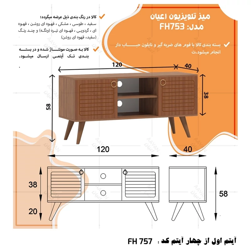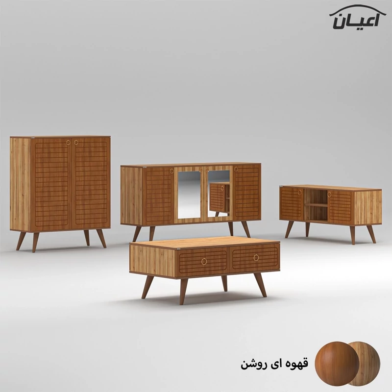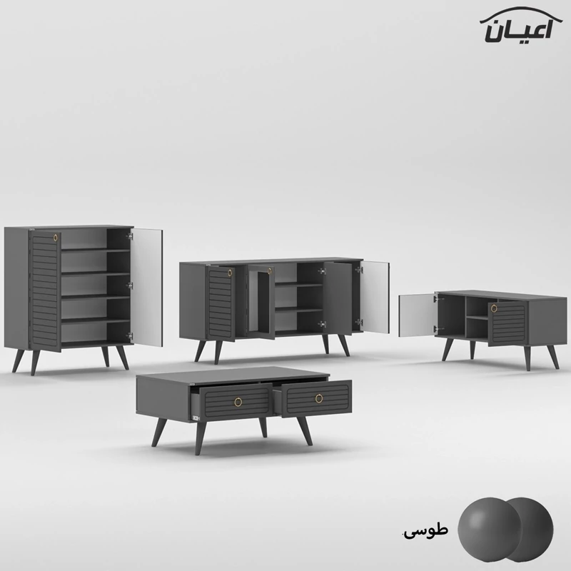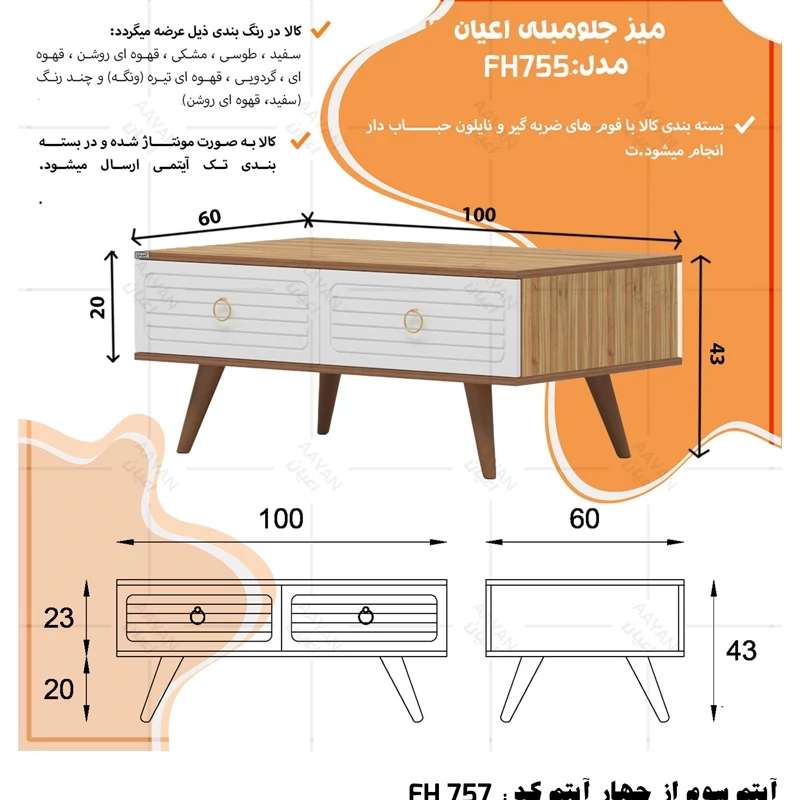 ست میز پذیرایی اعیان مدل FH757 مجموعه چهار عددی آیتم اول : میز تلویزیون اعیان ، جنس بدنه مغزی نئوپان با روکش ملامینه ، جنس درب ها مغزی ام دی اف با روکش وکیوم ، دارای یک طبقه و دو قفسه ، دارای دو درب کمدی با باز شوی لولا آرام بند ، دارای پایه مخروطی 20سانتی متری از جنس پلی اورتان، این کالا را فقط با لوگو و برند اعیان تهیه کنید ، این کالا در رنگ بندی (سفید ، طوسی ، مشکی ، قهوه ای روشن ، قهوه ای (گردویی) ، قهوه ای تیره (ونگه) و حالت چند رنگ (سفید ، قهوه ای روشن) ) تهیه و تولید می شود. لطفا توجه داشته باشید که همواره چند درجه اختلاف رنگ بین تصاویر بارگذاری شده و کالای ساخته شده وجود دارد. آیتم دوم : میز کنسول اعیان ، جنس بدنه مغزی نئوپان با روکش ملامینه ، جنس درب های طرح دار (CNC) مغزی ام دی اف با روکش وکیوم ، دارای دو طبقه و سه قفسه ، دارای چهار درب کمدی با باز شوی لولا آرام بند ، این کالا را فقط با لوگو و برند اعیان تهیه کنید . لطفا توجه داشته باشید که همواره چند درجه اختلاف رنگ بین تصاویر بارگذاری شده و کالای ساخته شده وجود دارد. آیتم سوم : میز جلو مبلی اعیان ، جنس بدنه : مغزی نئوپان با روکش ملامینه ، جنس درب های طرح دار (CNC) مغزی ام دی اف با روکش وکیوم ، دارای چهار کشو با ریل سه تکه ساچمه ای (استیل) ، پایه های مخروطی 20سانتی ، این کالا را فقط با لوگو و برند اعیان تهیه کنید . لطفا توجه داشته باشید که همواره چند درجه اختلاف رنگ بین تصاویر بارگذاری شده و کالای ساخته شده وجود دارد. آیتم چهارم : جاکفشی اعیان، جنس بدنه : مغزی نئوپان با روکش ملامینه ، جنس درب های طرح دار (CNC) مغزی ام دی اف با روکش وکیوم ، دارای چهار طبقه و پنج قفسه ، دارای پایه های مخروطی 20سانتی متری ، دارای دستگیره گوشواره ای طلایی، درب ها به صورت آرام بند است و کالا به صورت مونتاژ شده ارسال می گردد. این کالا را فقط با لوگو و برند اعیان تهیه کنید ، این کالا در رنگ بندی (سفید ، طوسی ، مشکی ، قهوه ای روشن ، قهوه ای (گردویی) ، قهوه ای تیره (ونگه) و حالت چند رنگ (سفید ، قهوه ای روشن) ) تولید می شود. لطفا توجه داشته باشید که همواره چند درجه اختلاف رنگ بین تصاویر بارگذاری شده و کالای ساخته شده وجود دارد.