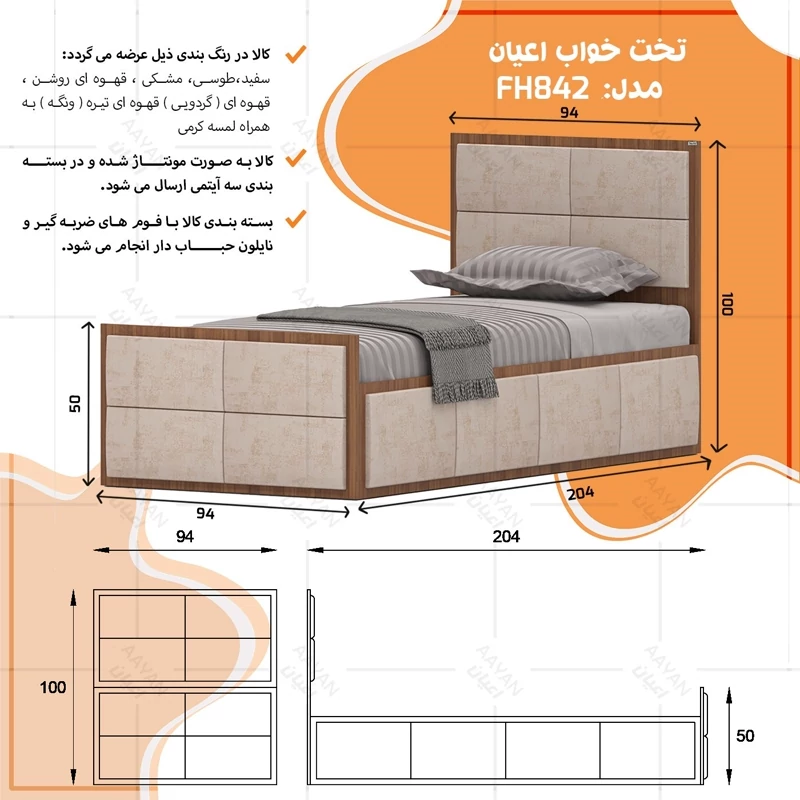 تخت خواب یک نفره اعیان مدل FH842 سایز 90x200 سانتی متر (پس کرایه)