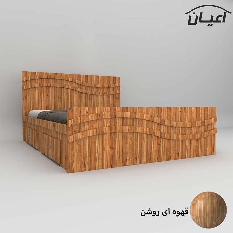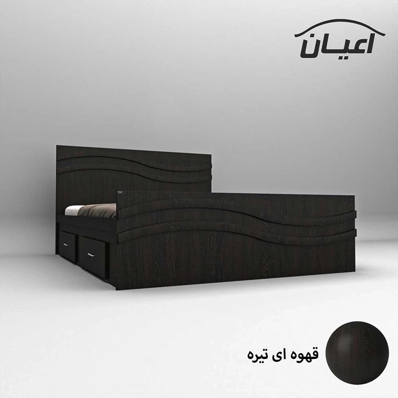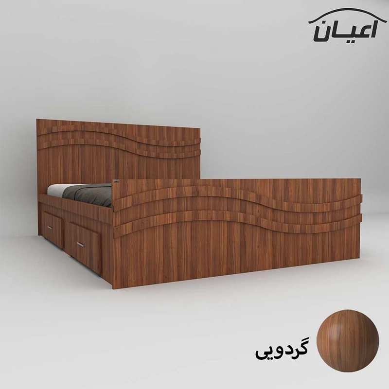 تخت خواب دونفره اعیان-جنس نئوپان ملامینه شرکتی - کلگی بالا دارای قید سی ان سی منحنی است که به صورت دوبل می باشد - دارای دو کشو(به صورت چرخدار و قابل جابجایی) است