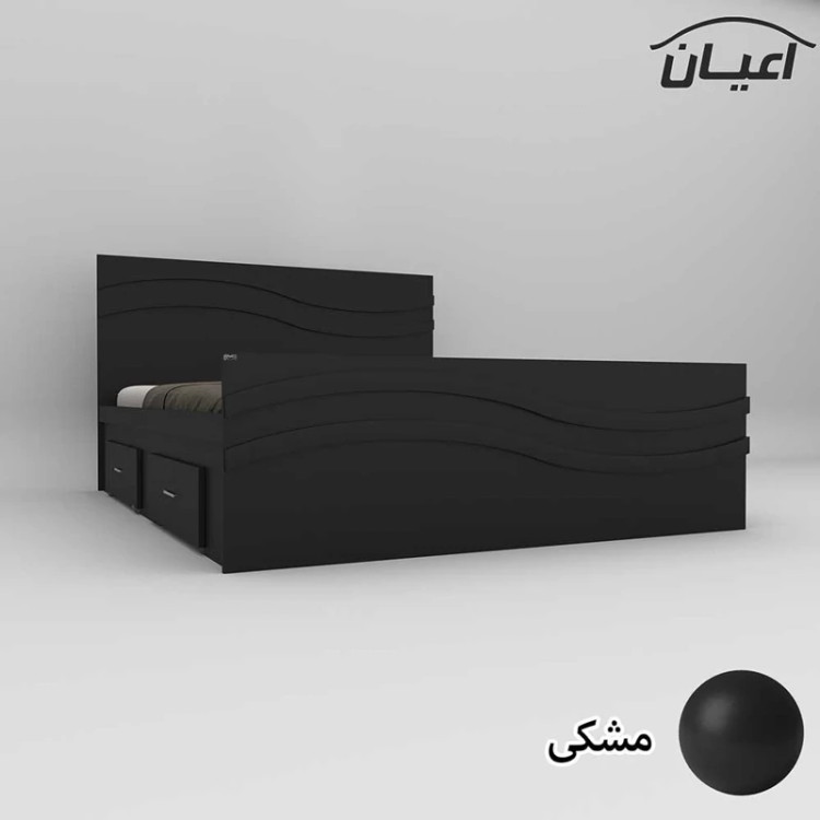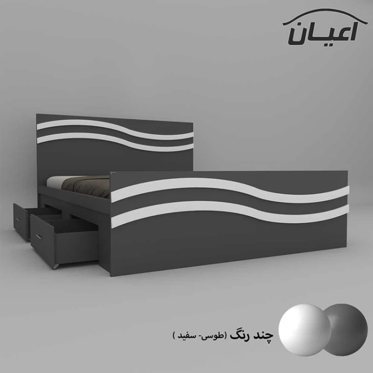 تخت خواب دونفره اعیان-جنس نئوپان ملامینه شرکتی - کلگی بالا دارای قید سی ان سی منحنی است که به صورت دوبل می باشد - دارای دو کشو(به صورت چرخدار و قابل جابجایی) است