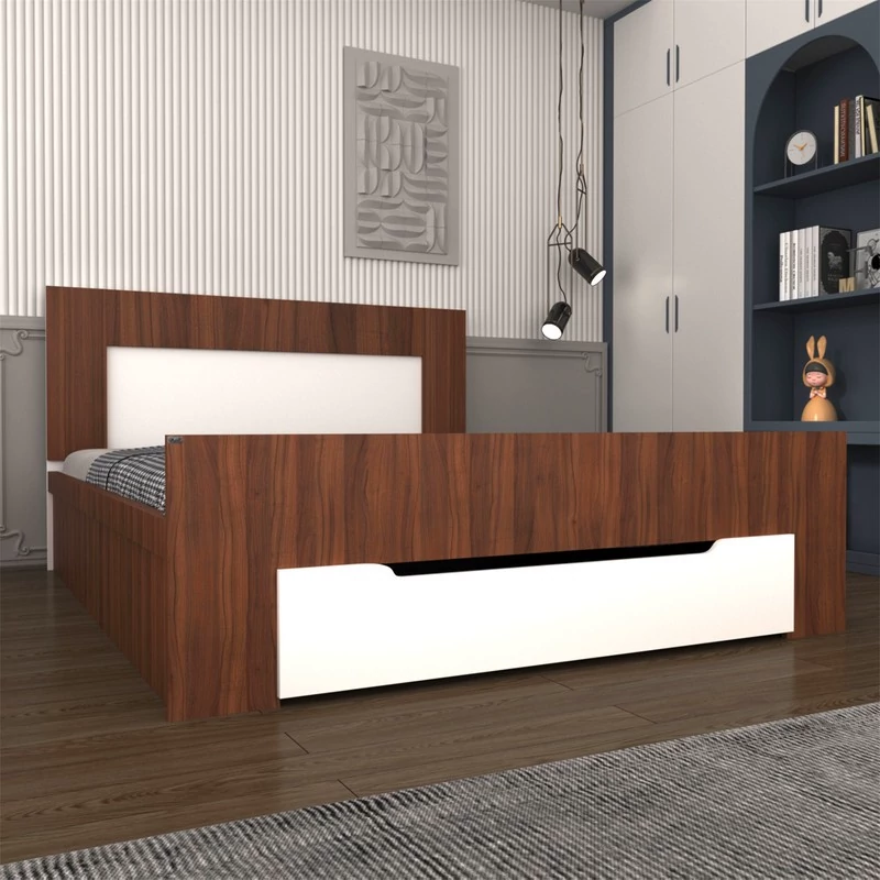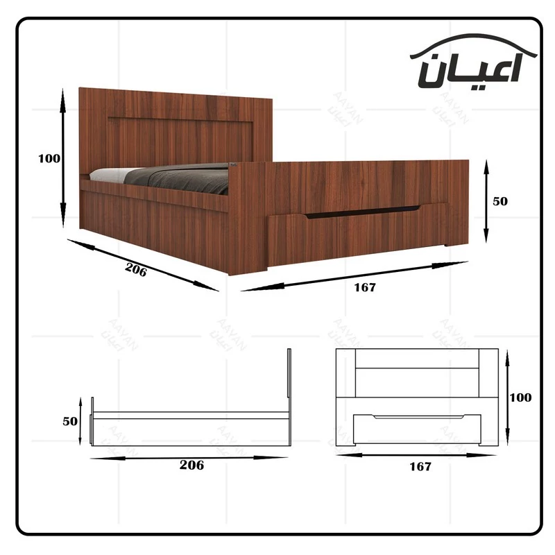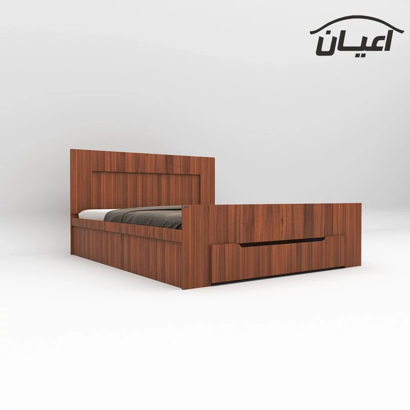 تخت خواب دونفره اعیان-جنس نئوپان ملامینه شرکتی.دارای کشو و دستگیره به صورت سی ان سی-کشو به صورت چرخدار است - کالا فاقد تشک می باشد. سایز تشک مناسب 160x200سانت است.کالا به صورت مونتاژ نشده(جدا از هم) ارسال می شود - بسته بندی کالا به صورت چهار آیتمی است - جنس کفی تخت نئوپان خام به صورت سه تکه است-رنگ بندی کالا در آلبوم قابل مشاهده است(در رنگ های سفید/مشکی/قهوه ای/قهوه ای روشن/قهوه ای تیره (ونگه) و چند رنگ تولید می شود)-تنها در صورتی کالای انتخابی مطابق با تصاویر و مشخصات درج شده خواهد بود که هنگام انتخاب فروشنده، فروشنده رسمی برند اعیان یعنی اعیان دکورا که با تیک آبی مشخص شده است را انتخاب نمایید.