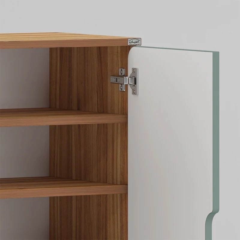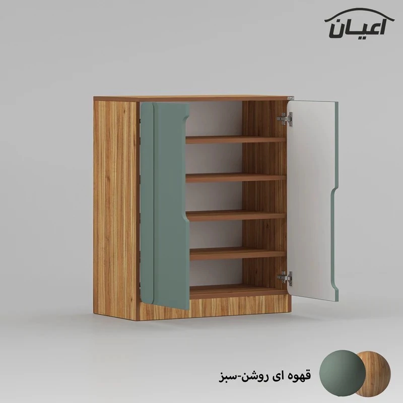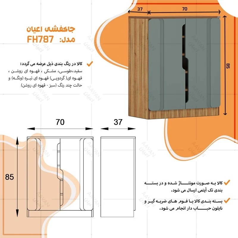 جاکفشی اعیان ، جنس بدنه مغزی نئوپان با روکش ملامینه ، جنس درب ها از ام دی اف با روکش وکیوم همراه با بازشوی لولای آرام بند ، دارای چهار طبقه و پنج فضا جهت قرار دادن کفش ها ، طراحی CNC خاص و منحصر به فرد اعیان بر روی درب ها و دستگیره های در ، این کالا را فقط با برند و لوگو اعیان تهیه کنید ، این کالا در رنگ بندی (سفید ، طوسی ، مشکی ، قهوه ای روشن ، قهوه ای(گردویی) ، قهوه ای تیره(ونگه)و حالت چند رنگ (قهوه ای روشن ، سبز) تولید و عرضه می گردد.در نظر داشته باشید همواره چند درجه اختلاف رنگ بین تصاویر کالا و کالای ساخته شده وجود دارد