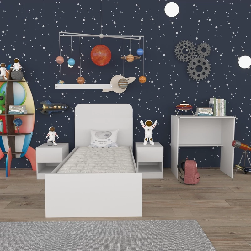 جنس مغزی نئوپان با روکش ملامینه شرکتی بوده و این محصول از کودکی تا نوجوانی فرزند شما قابل استفاده می باشد و شما با خرید این محصول می توانید تا سالها از خرید مصنوعات چوبی اتاق کودک بی نیاز گردید چرا که این تختخواب چندمنظوره، قابلیت باز شدن و تبدیل به تخت خواب نوجوان با ابعاد کفی 180*80 سانتی متر ، دو عدد پاتختی و یک میز تحریر را دارا می باشد.