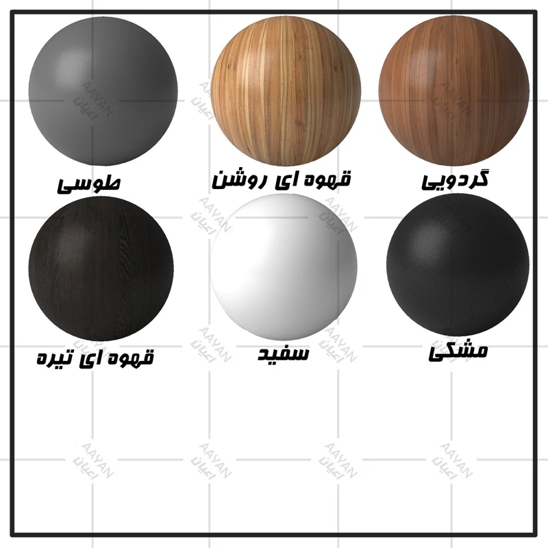 این کالا در رنگبندی :(سفید ، طوسی ، مشکی ، قهوه ای روشن ، قهوه ای (گردویی) ، قهوه ای تیره (ونگه) و حالت چند رنگ ( قهوه ای ، طوسی ) تولید و عرضه می گردد . لطفا توجه داشته باشید که همواره چند درجه اختلاف رنگ بین تصاویر بارگذاری شده و کالای ساخته شده وجود دارد.