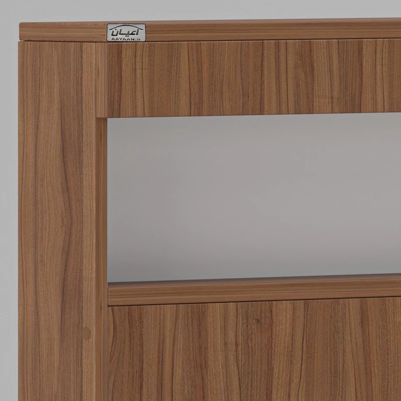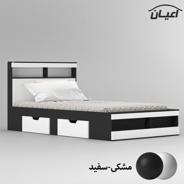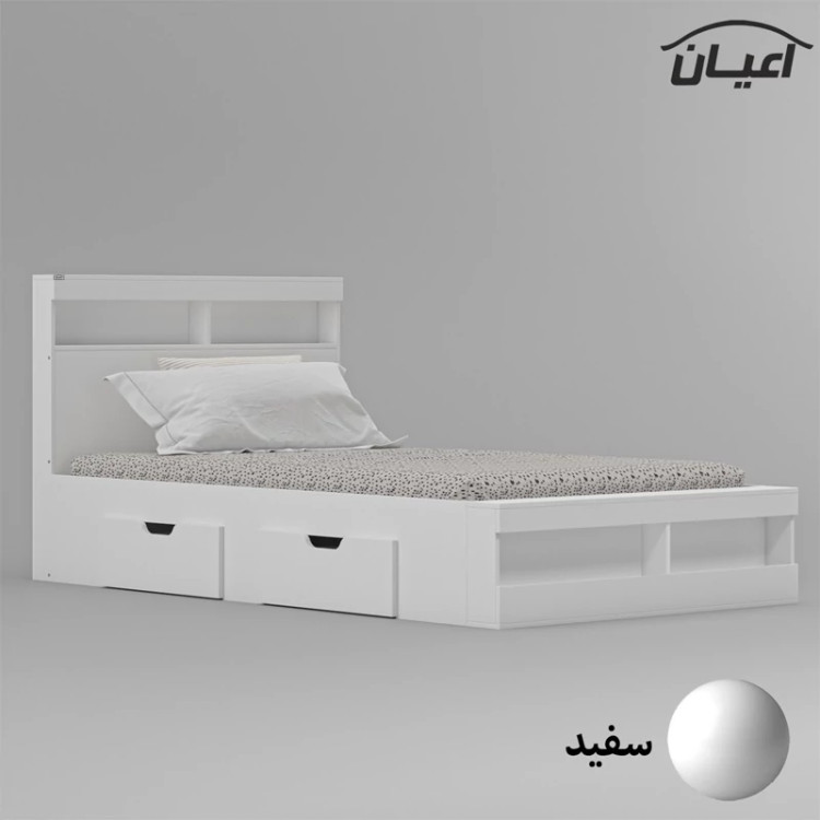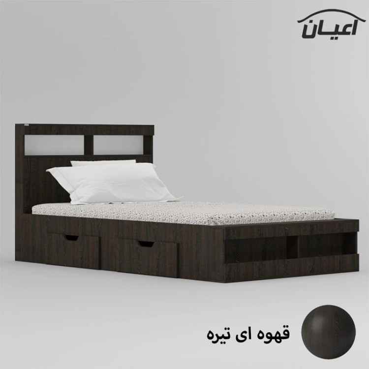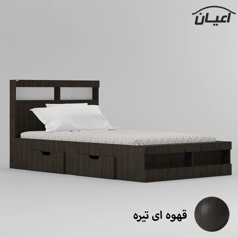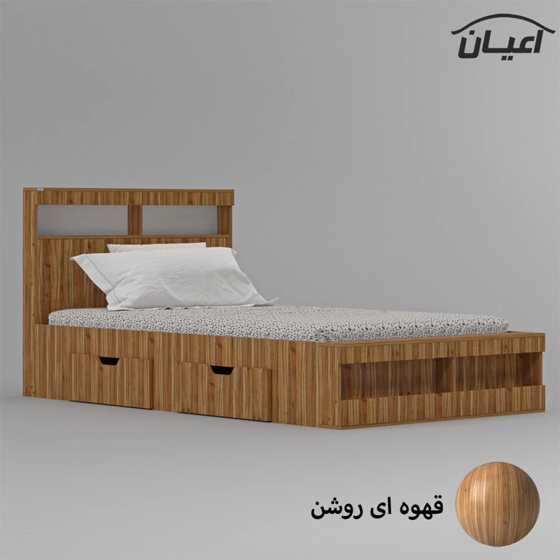 تخت خواب یکنفره اعیان-جنس مغزی نئوپان با روکش ملامینه شرکتی-کالا دارای یک باکس در قسمت کلگی بالا و یک باکس قسمت کلگی پایین است-دارای دو کشو چرخدار-کشو ها امکان جابجایی به طرفین را دارد-دستگیره کشو ها به صورت سی ان سی منحنی می باشد