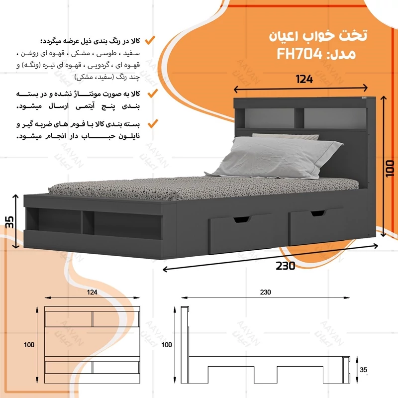 تخت خواب یک نفره اعیان مدل FH704 سایز 120x200 سانتی متر ( ارسال با باربری - هزینه ارسال پس کرایه)
