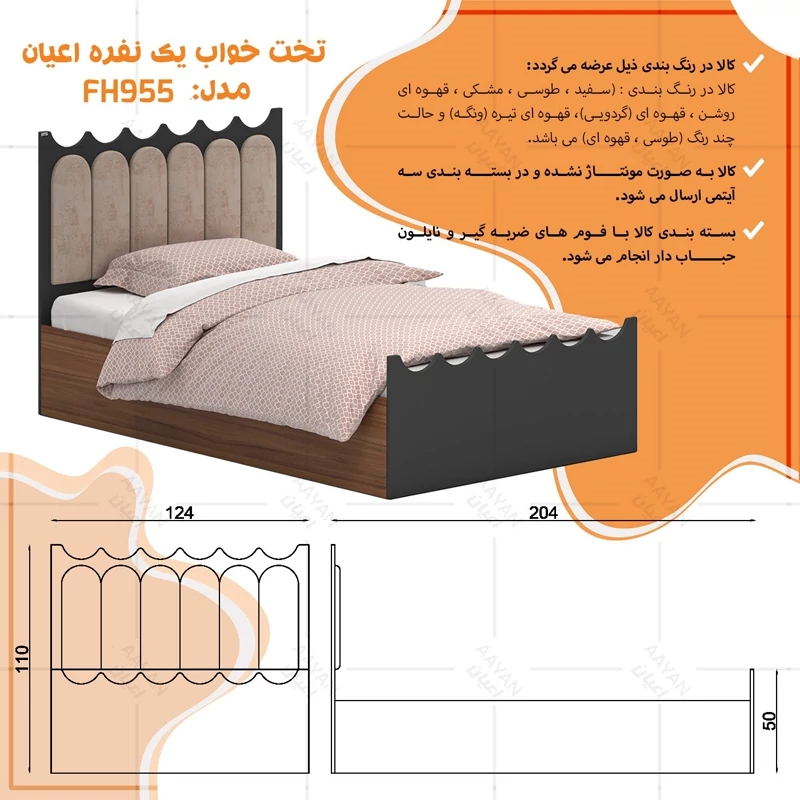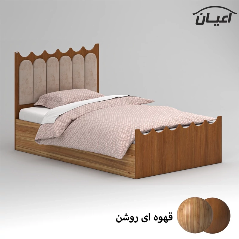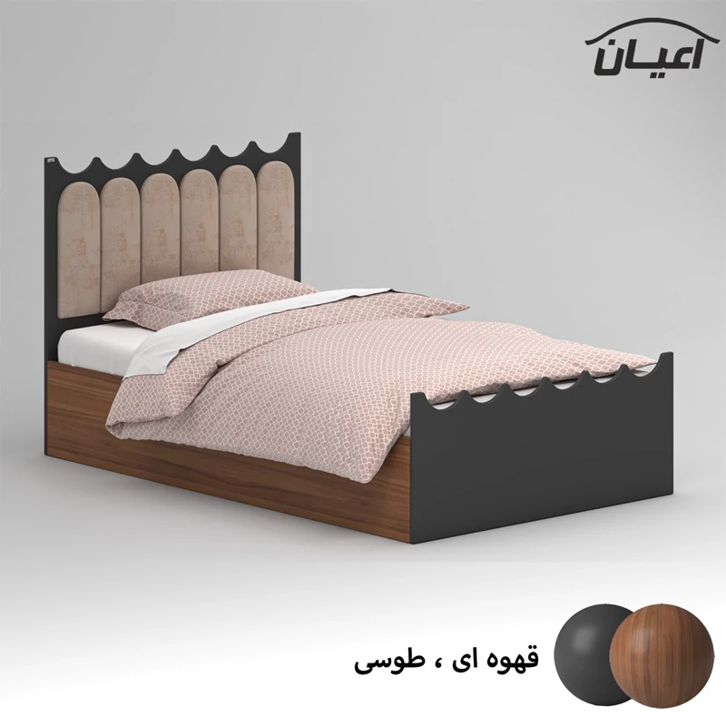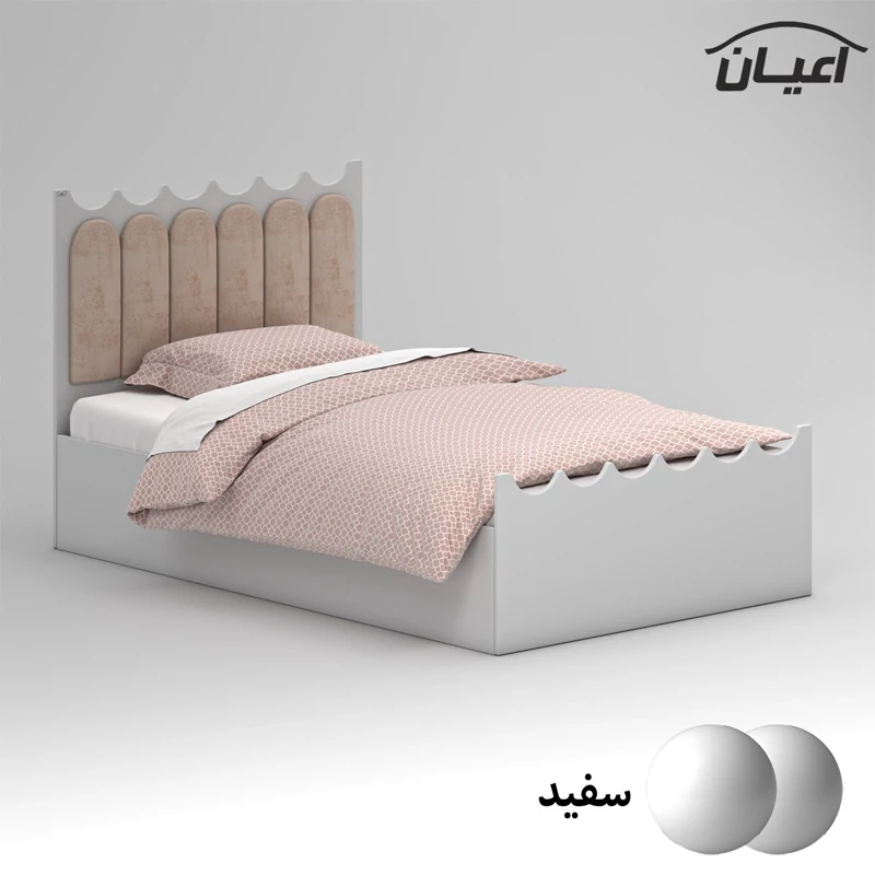 تخت خواب یک نفره اعیان ، کلگی های تخت خواب دارای طراحی cnc می باشد ، جنس کلگی ها مغزی ام دی اف با روکش وکیوم و جنس بغل تخت ها نئوپان با روکش ملامینه ، طرحی ساده ، شیک و ترکیب با لمسه کرمی ، کالا فاقد تشک می باشد ، کفی به صورت دو تکه به همراه چند جفت پایه متحرک، سایز تشک مناسب برای تخت خواب(200×120 سانتی متر) ، این کالا با رنگ بندی (سفید ، طوسی ، مشکی ، قهوه ای روشن ، قهوه ای (گردویی) ، قهوه ای تیره (ونگه) و حالت چند رنگ (طوسی،قهوه ای) ) تولید و عرضه می شود ، این کالا را فقط با لوگو و برند اعیان تهیه کنید، لطفا توجه داشته باشید که همواره چند درجه اختلاف رنگ بین تصاویر بارگذاری شده و کالای ساخته شده وجود دارد.