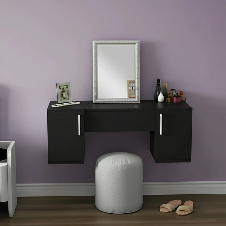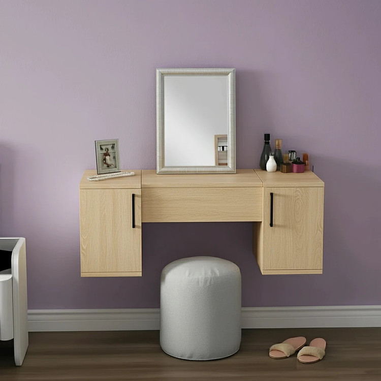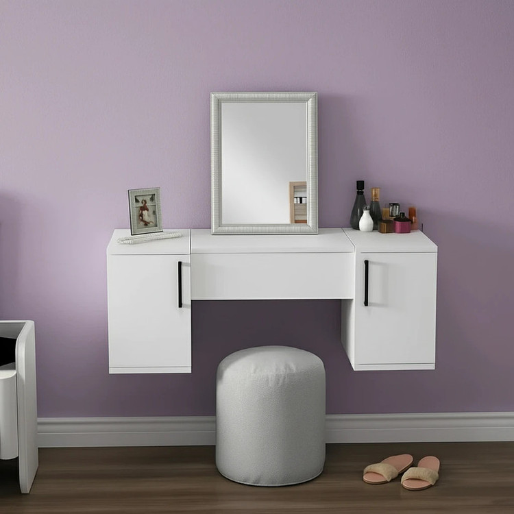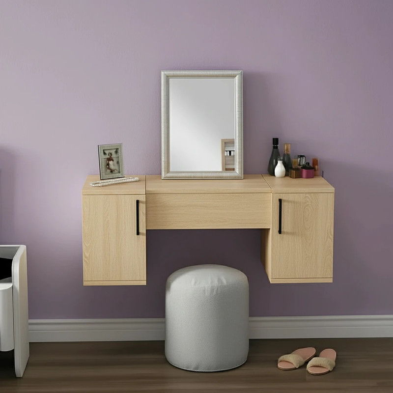 میز آرایش جنس روکش از ملامینه میباشد و دارای دو درب و یک باکس با لولای آرام بند با کیفیت و این کالا از استحکام و مقاومت بالایی برخوردار است و در رنگ بندی های زیبا و شکیل میباشد. (((((( کالای ارسالی دارای صندلی و آیینه نمیباشد))))))