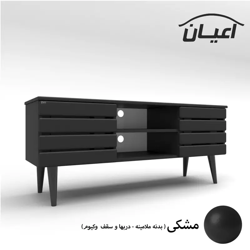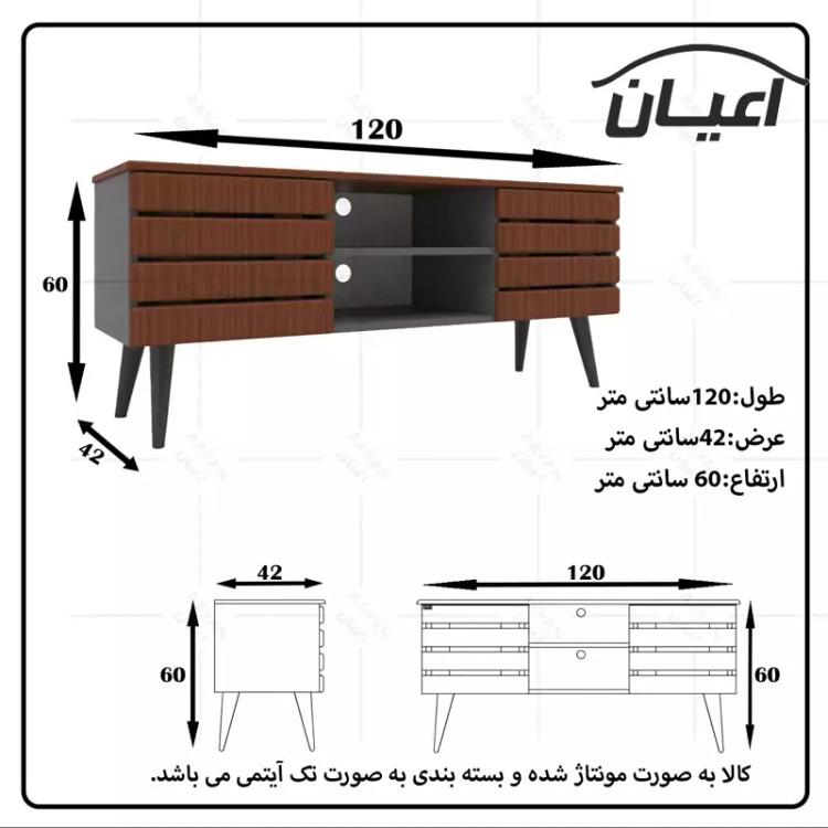 میز تلویزیون اعیان - بدنه جنس نئوپان ملامینه شرکتی و دربها و سقف مغزی ام دی اف با روکش وکیوم می باشد- سطح ضدخش - طراحی مدرن -دارای دو درب کمدی- درب ها به صورت آرام بند می باشد-.دارای دو فضاب مجزا که جاکابلی جهت عبور سیم تعبیه شده است- بسته بندی با لوگو و برند اعیان. هنگام خرید و دریافت کالا به بسته بندی و لوگوی برند اعیان دقت فرمایید. این کالا توسط برند اعیان در رنگ های سفید/مشکی/قهوه ای/قهوه ای روشن/قهوه ای تیره (ونگه)/گردویی/طوسی و چند رنگ (طوسی و قهوه ای)تولید می شود.