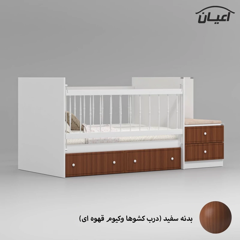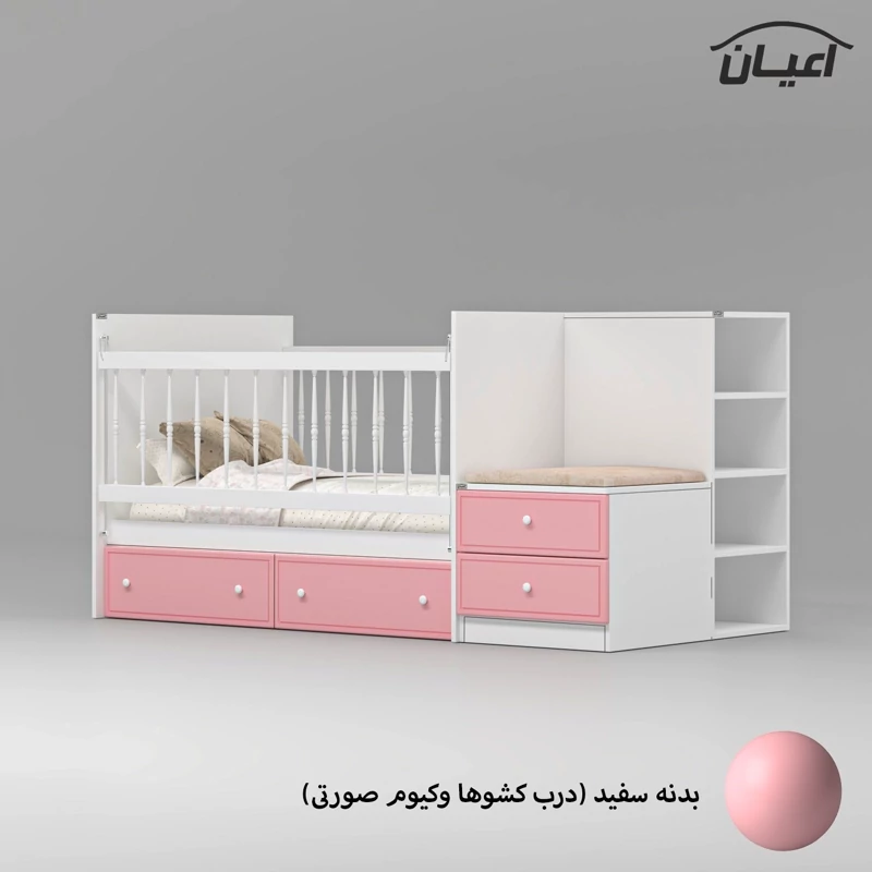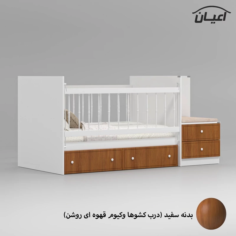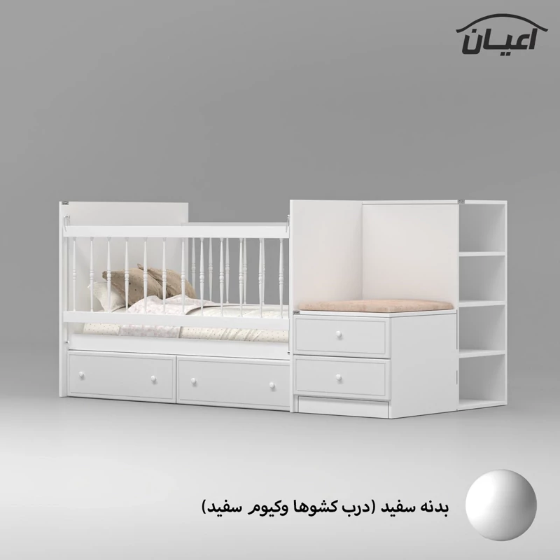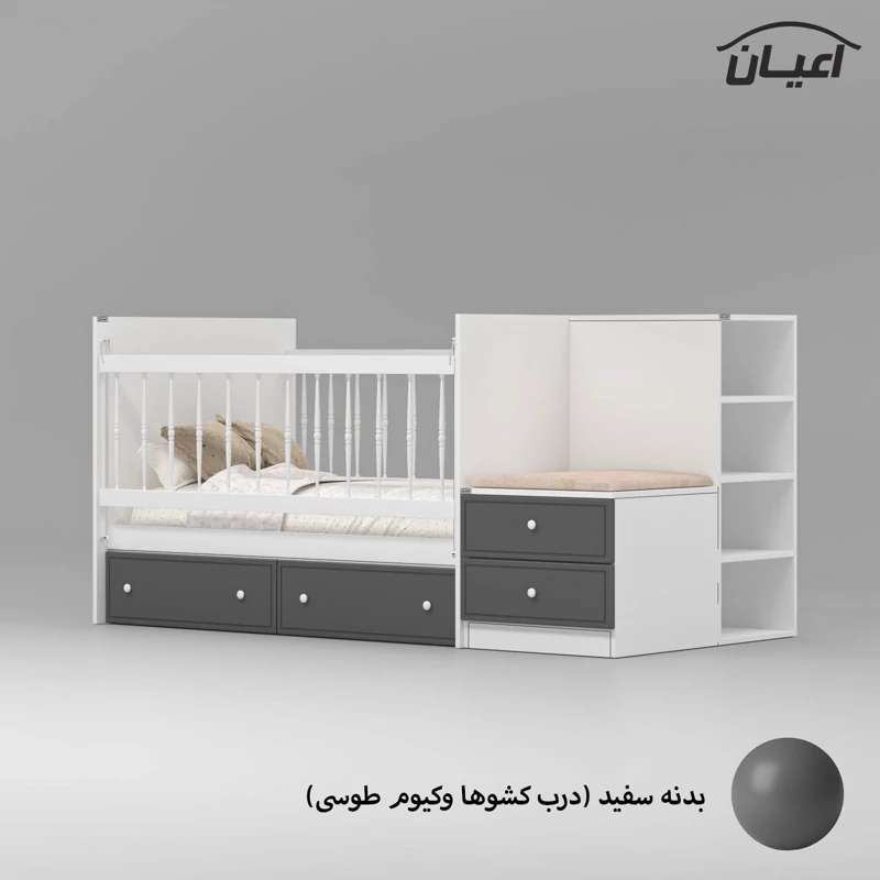 تخت خواب کودک اعیان ، جنس بدنه مغزی نئوپان با روکش ملامینه ، جنس درب کشو ها : مغزی ام دی اف با روکش وکیوم ، دارای چهار کشو با بازشوی ریل سه تکه و چهار شلف کوچک در قسمت پایین تخت ، دارای کتابخانه و نشیمن (کشو دار) که با توجه به چیدمان اتاق کودکتان می توانید در هر دو طرف تخت یا فضای دلخواه از آنها استفاده کنید.حفاظ یک طرف کار به صورت آسانسوری(سمت کشوها) و نرده ها به صورت خراطی و از جنس pvc است (یک طرف ثابت و یک طرف متحرک) ، کالا فاقد تشک بوده و سایز تشک مناسب کار 70×130سانت می باشد. این کالا در رنگ بندی (سفید ، طوسی ، مشکی ، قهوه ای روشن ، قهوه ای (گردویی) ، قهوه ای تیره (ونگه) ، آبی ، صورتی و سبز) تولید و عرضه می گردد ، دقت کنید که در تمامی رنگ ها بدنه ی اصلی کالا سفید می باشد و معیار انتخاب رنگ ، رنگ درب کشوها می باشد، توجه فرمایید که همواره چند درجه اختلاف رنگ بین تصاویر بارگزاری شده و کالای ساخته شده وجود دارد.
