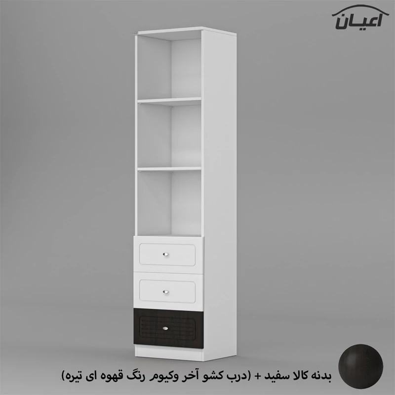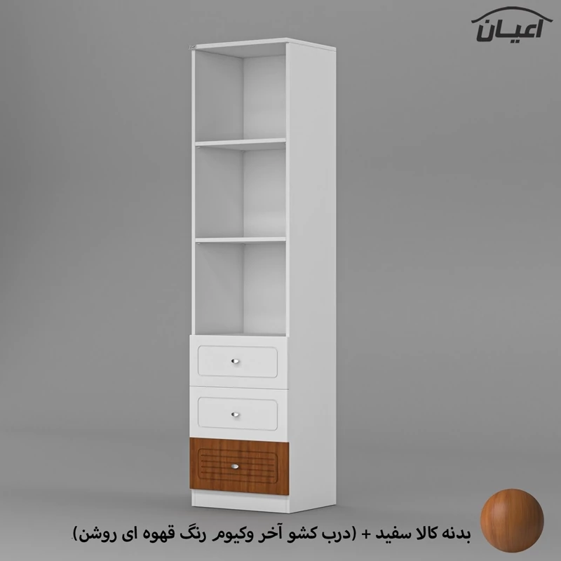 کتابخانه اعیان-جنس مغزی نئوپان با روکش ملامینه شرکتی-دارای سه کشو با ریل سه تکه ، دستگیره به صورت تک پیچ استیل و جنس درب کشو مغزی ام دی اف با روکش وکیوم -دارای دو طبقه و سه فضای مجزا - رنگبندی کالا:سفید/طوسی/مشکی/قهوه ای روشن/قهوه ای (گردویی)/قهوه ای تیره/سبز/آبی و صورتی می باشد ، رنگ بندی کالا در آلبوم قابل مشاهده است.