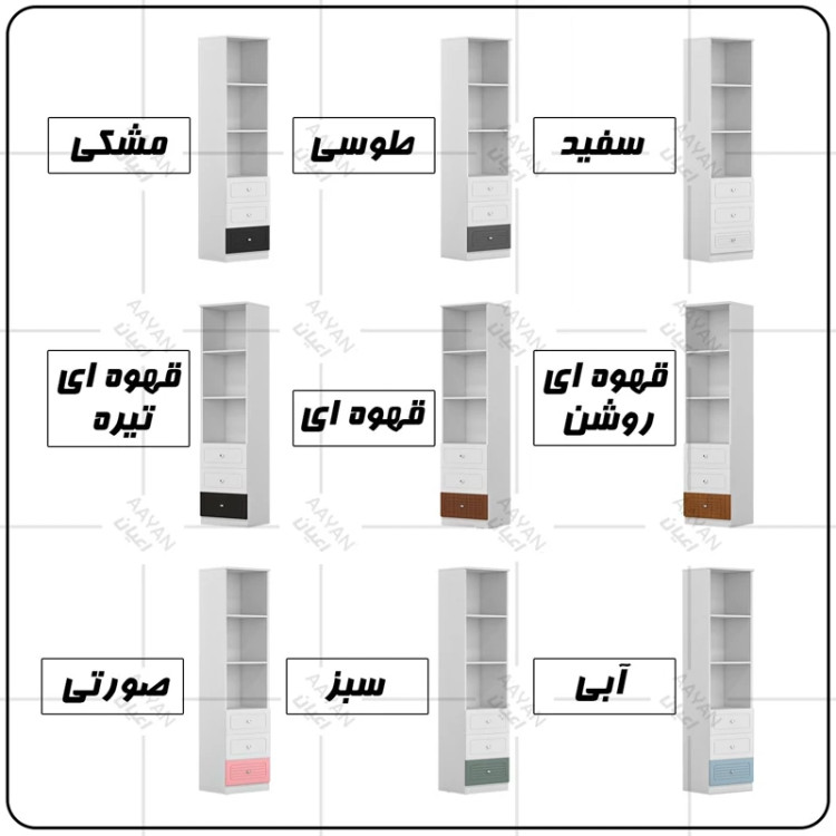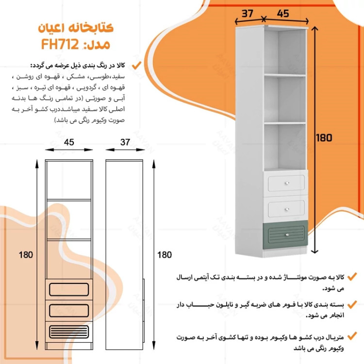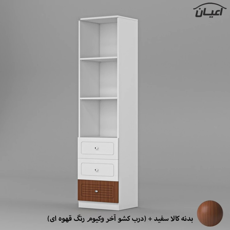کتابخانه اعیان-جنس مغزی نئوپان با روکش ملامینه شرکتی-دارای سه کشو با ریل سه تکه ، دستگیره به صورت تک پیچ استیل و جنس درب کشو مغزی ام دی اف با روکش وکیوم -دارای دو طبقه و سه فضای مجزا - رنگبندی کالا:سفید/طوسی/مشکی/قهوه ای روشن/قهوه ای (گردویی)/قهوه ای تیره/سبز/آبی و صورتی می باشد ، رنگ بندی کالا در آلبوم قابل مشاهده است.
