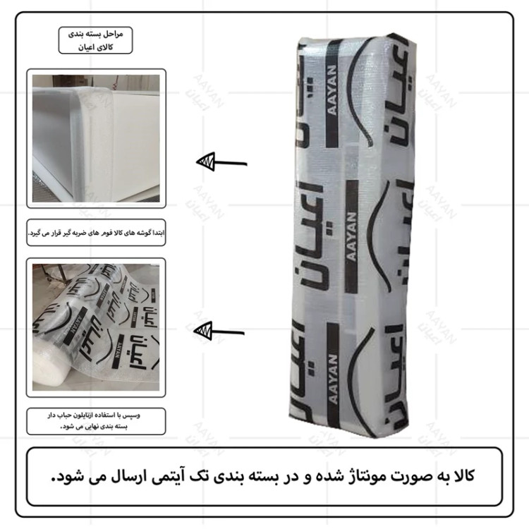 کالا به صورت مونتاژ شده و در بسته بندی تک آیتمی با لوگو و برند اعیان ارسال می شود.