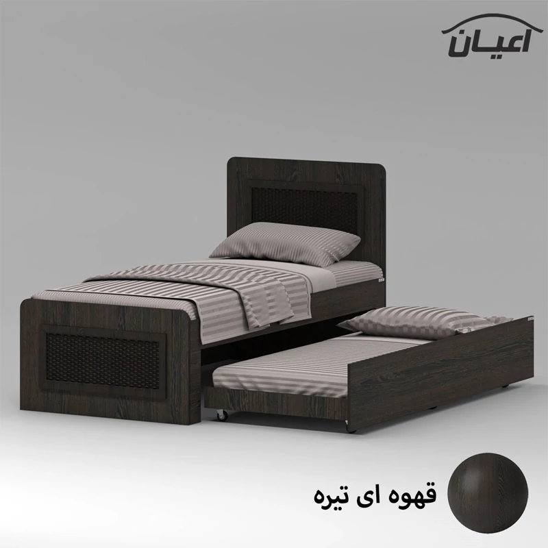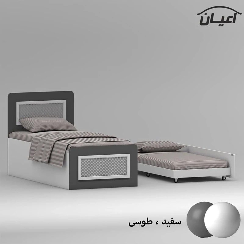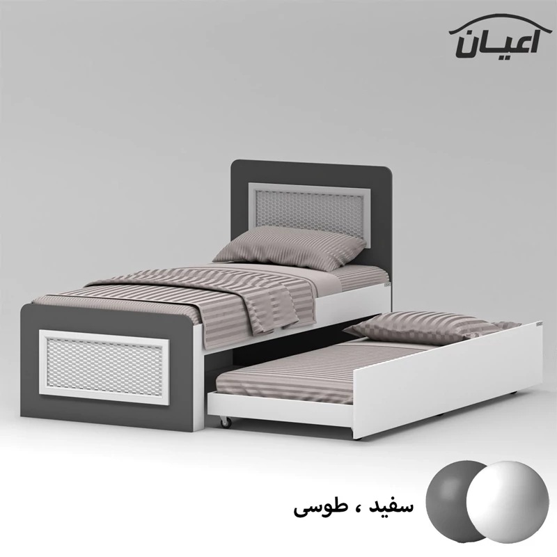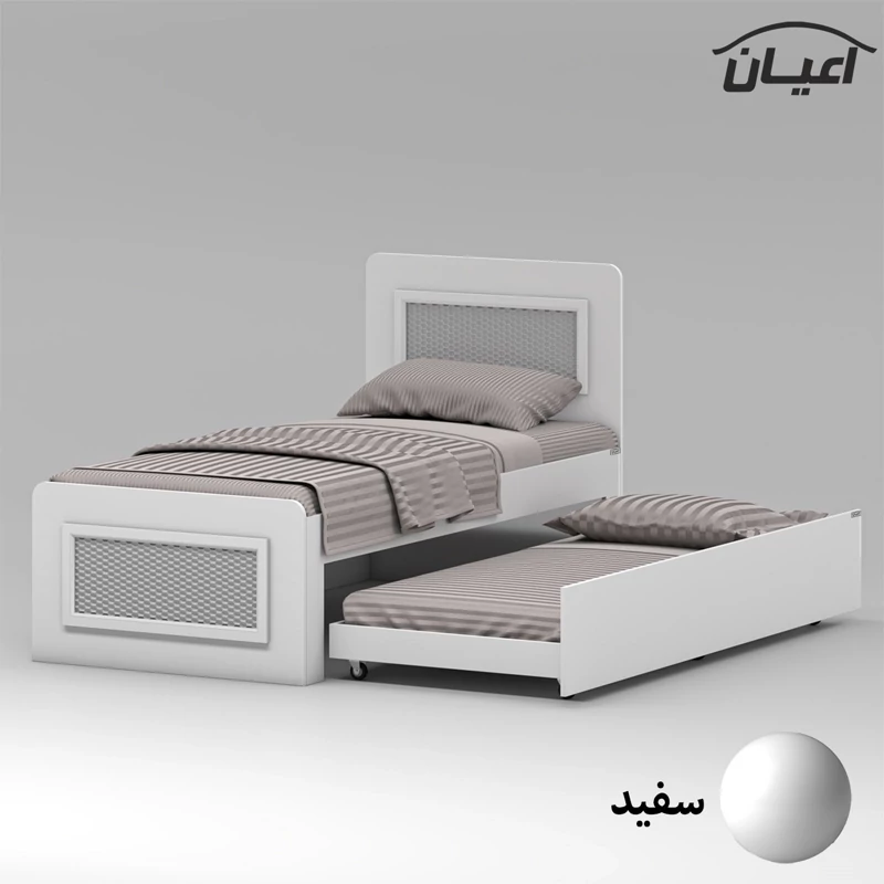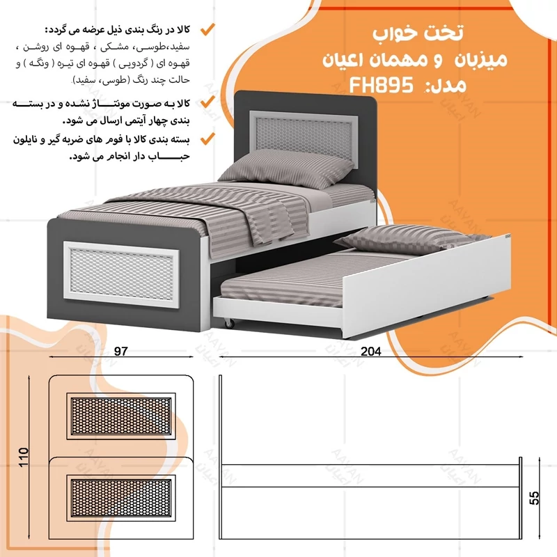 تخت خواب مهمان و میزبان اعیان ، جنس مغزی نئوپان با روکش ملامینه ، جنس نماهای کار شده روی کلگی ها مغزی ام دی اف با روکش وکیوم ، این تخت خواب مدرن، برای تشک های نوجوان 80*180و یک نفره 90*200 سانتی متر قابل استفاده بوده و تشک اصلی (میزبان)سایز یکنفره و تشک دوم (مهمان) سایز نوجوان بایستی تهیه نمایید.این محصول کاربردی، در نگاه اول یک تخت ساده به نظر می رسد. اما در حقیقت با داشتن آن، شما یک تختخواب با یک کشوی وسیع و جادار دارید؛ یعنی دو تخت را در قالب یک محصول دارید. کشو این محصول که به راحتی و به کمک چرخ خارج می شود، همان جای خوابی است در زمان آمدن مهمان می توانید آن را استفاده نمایید. این کشو، دستگیره ندارد، همچنین در صورت داشتن دو فرزند که از یک اتاق کمجا به صورت اشتراکی استفاده می کنند، این تخت نوجوان یا یکنفره را به عنوان تختخواب دو طبقه جمع و جور می توان برایشان به کار بُرد. این کالا فاقد تشک می باشد، سایز تشک مناسب برای تخت خواب(200×90 سانتی متر و 180×80 سانتی متر) می باشد ، این کالا با رنگ بندی (سفید ، طوسی ، مشکی ، قهوه ای روشن ، قهوه ای (گردویی) ، قهوه ای تیره (ونگه) و حالت چند رنگ( سفید ، طوسی) تولید و عرضه می شود ، این کالا را فقط با لوگو و برند اعیان تهیه کنید، لطفا توجه داشته باشید که همواره چند درجه اختلاف رنگ بین تصاویر بارگذاری شده و کالای ساخته شده وجود دارد.