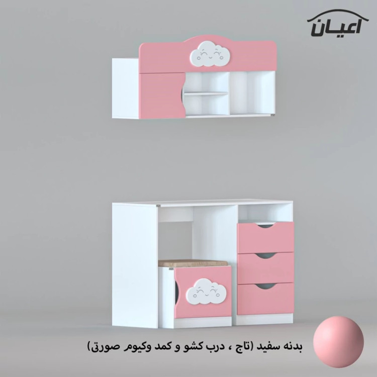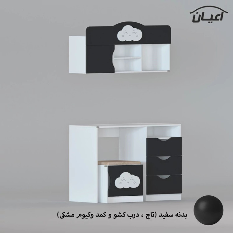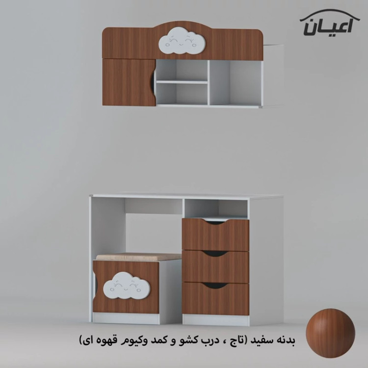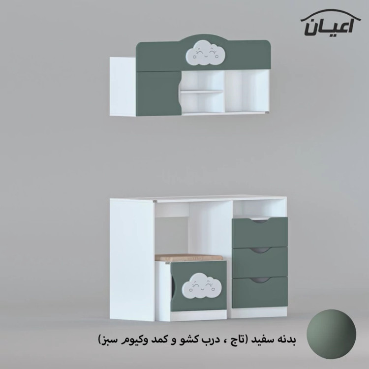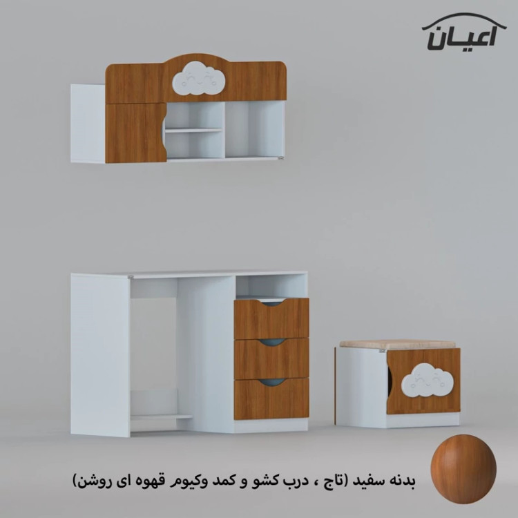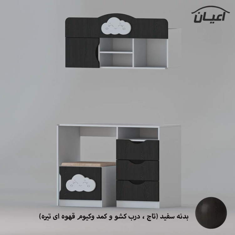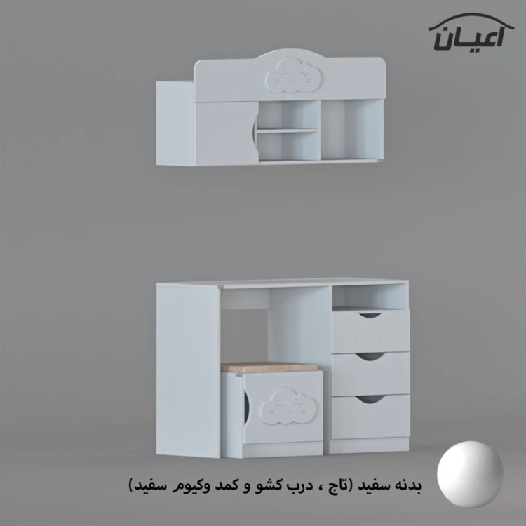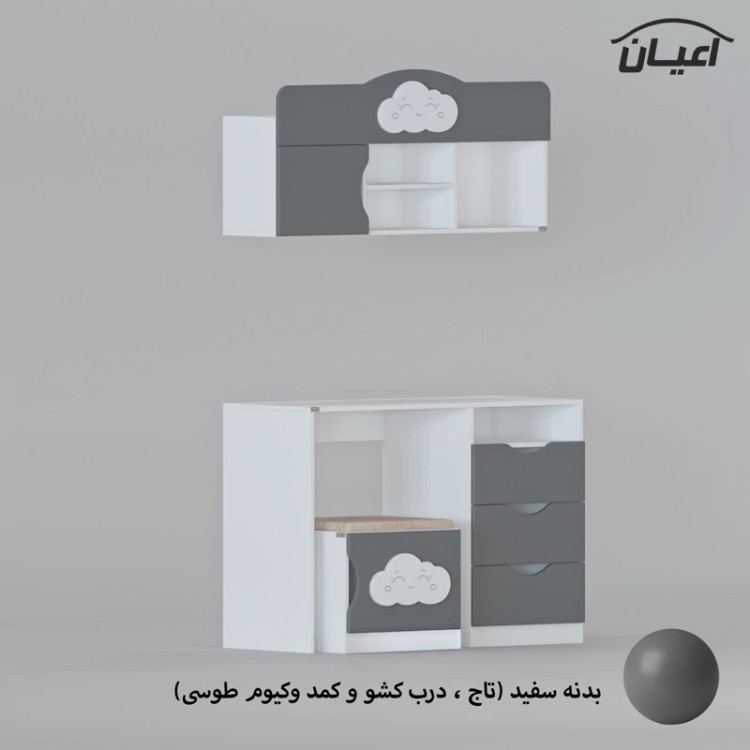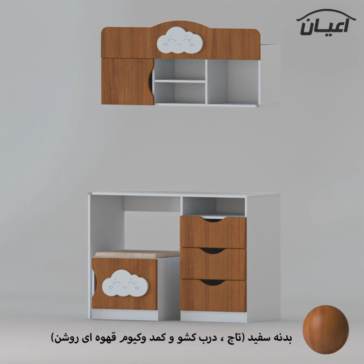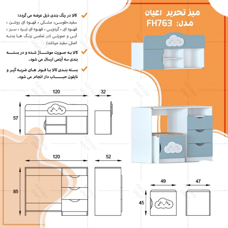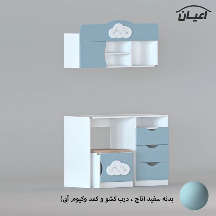 میز تحریر کودک و نوجوان اعیان طرح ابر ، مجموعه سه آیتمی ، جنس درب کشو ، درب کمدی و تاج کالا : مغزی ام دی اف با روکش وکیوم است ، جنس بدنه کالا : مغزی نئوپان با روکش ملامینه ، دارای سه کشو با ریل سه تکه ساچمه ای ، یک فضا با درب کمدی و دارای چهار فضای مجزا جهت استفاده به عنوان شلف و کتابخانه ،دارای یک باکس با بازشوی درب کمدی و لمسه که به عنوان صندلی قابل استفاده می باشد ، ارسال به صورت مونتاژ شده و سه آیتمی می باشد ،