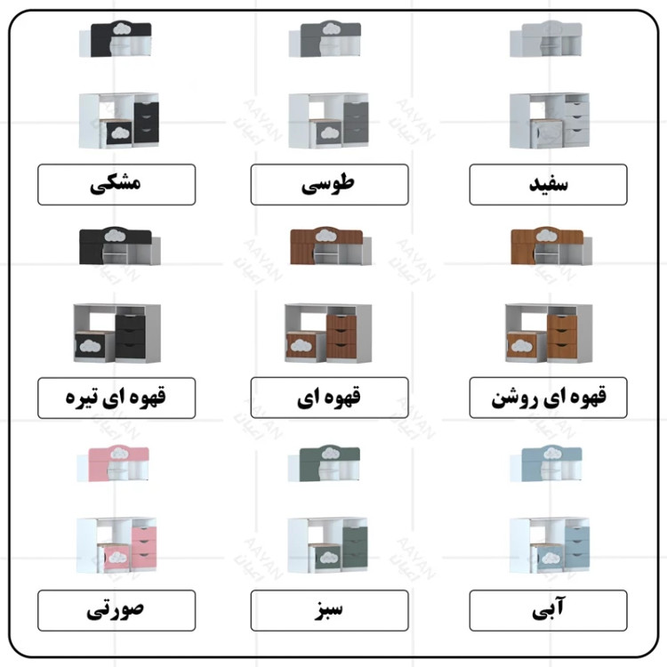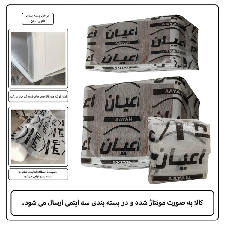 این کالا را فقط با برند و لوگو اعیان تهیه کنید ، این کالا در رنگ بندی (سفید، طوسی ، مشکی ، قهوه ای روشن ، قهوه ای(گردویی) ، قهوه ای تیره(ونگه) ، سبز ، آبی و صورتی) تولید و عرضه می شود. لطفا توجه فرمایید که همواره چند درجه اختلاف رنگ بین تصاویر بارگذاری شده و کالای ساخته شده وجود دارد.
