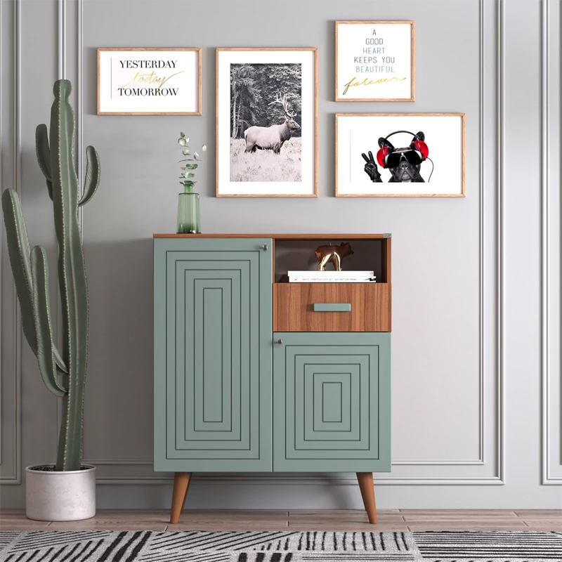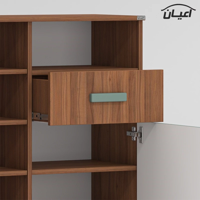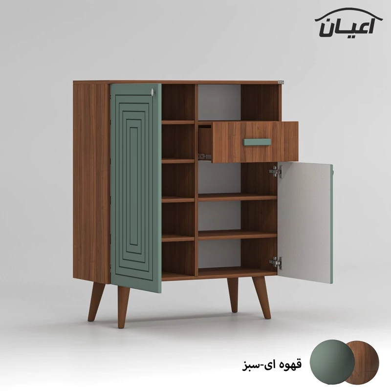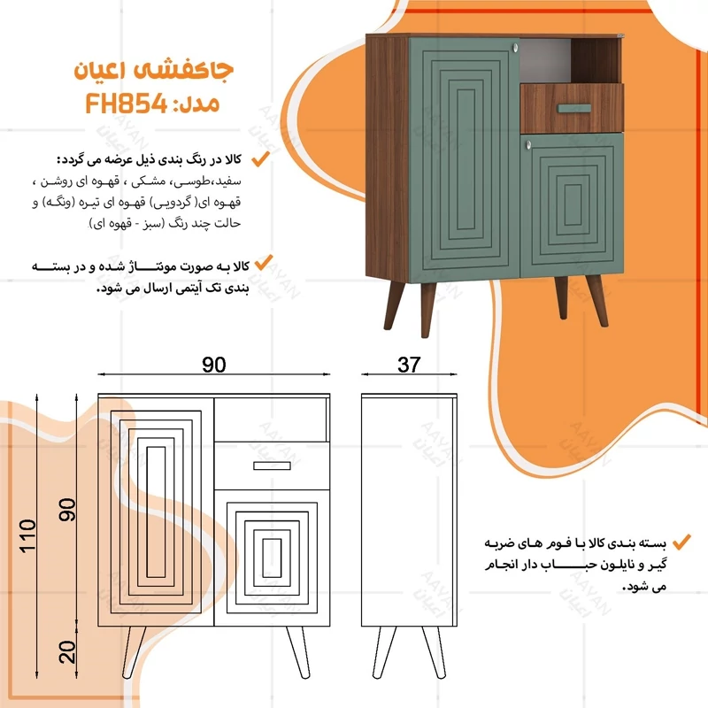 جاکفشی اعیان ، جنس بدنه : مغزی نئوپان با روکش ملامینه ، جنس درب کشو ها : مغزی ام دی اف با روکش وکیوم (به دلیل تفاوت متریال بدنه و درب ها شاهد تفاوت رنگی بین بدنه و درب ها در رنگ بندی کالا خواهیم بود) این جاکفشی دارای یک کشو با ریل سه تکه ساچمه ای و دو درب کمدی با لولای آرام بند با دو طبقه و سه فضا در یک سمت و چهار طبقه وپنج فضا در سمت دیگر برای قرار دادن کفش است که طبقات متحرک بوده و روی پین (خار) طبقه قرار می گیرند . در بالای فضای کمدی نیز یک شلف قرار دارد که می توانید به عنوان محفظه اکسسوری یا ملزومات مدنظر استفاده نمایید ( در نظر داشته باشید تمامی طبقات قابلیت تنظیم ارتفاع ندارند و تنها قابلیت برداشتن و قراردادن مجدد وجود دارد) ، پایه های کار از جنس پلی اورتان و به شکل مخروطی می باشد ، دستگیره های محصول به صورت تک پیچ استیل است و برای حفظ سلامت کالا و بسته بندی این دستگیره ها از داخل بسته می شود لطفا پس از بازکردن کار با استفاده از پیچ گوشتی جهت آن را تغییر دهید. این کالا را فقط با برند و لوگو اعیان تهیه کنید ، این کالا در رنگ بندی (سفید ، طوسی ، مشکی ، قهوه ای روشن ، قهوه ای(گردویی) ، قهوه ای تیره(ونگه) و حالت چند رنگ (مشابه تصاویر آلبوم شامل دو رنگ سبز ، قهوه ای است) تولید و عرضه می گردد. جاکفشی مذکور در یک بسته بندی حباب دار با لوگوی اعیان و به صورت مونتاژ شده (نصب شده) قرار دارد . در نظر داشته باشید همواره چند درجه اختلاف رنگ بین تصاویر کالا و کالای ساخته شده وجود دارد.