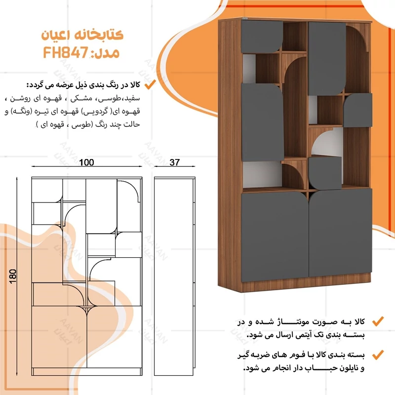 کتابخانه اعیان ، جنس مغزی نئوپان با روکش ملامینه ، دارای هفت درب کمدی با ابعاد مختلف با لولای آرام بند و دستگیره CNC کرو گوشه ی در ها ، دارای هشت طبقه با هشت فضای مجزا جهت قرار دادن کتاب و اکسسوری(مطابق تصاویر کالا) ، این کالا را فقط با برند و لوگو اعیان تهیه کنید ، این کالا در رنگ بندی : (سفید ، طوسی ، مشکی ، قهوه ای روشن ، قهوه ای (گردویی) ، قهوه ای تیره (ونگه) و حالت چند رنگ (قهوه ای ، طوسی) تولید و عرضه میگردد.لطفا توجه داشته باشید که همواره چند درجه اختلاف رنگ بین تصاویر بارگذاری شده و کالا وجود دارد.