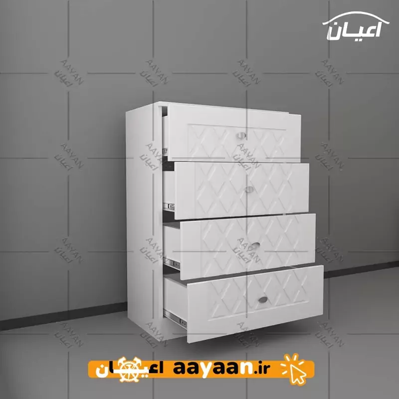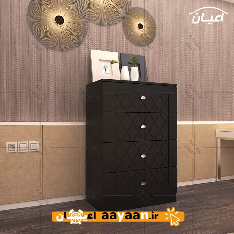 دراور اعیان - جنس نئوپان ملامینه شرکتی و وکیوم - سطح ضدخش - وزن متناسب با ابعاد.دارای چهار کشو بازشو - دستگیره تک پیچ - بسته بندی با لوگو و برند اعیان. هنگام خرید و دریافت کالا به بسته بندی و لوگوی برند اعیان دقت فرمایید. این کالا توسط برند اعیان در رنگ های سفید/مشکی/قهوه ای/قهوه ای روشن/قهوه ای تیره (ونگه)و چند رنگ تولید می شود.