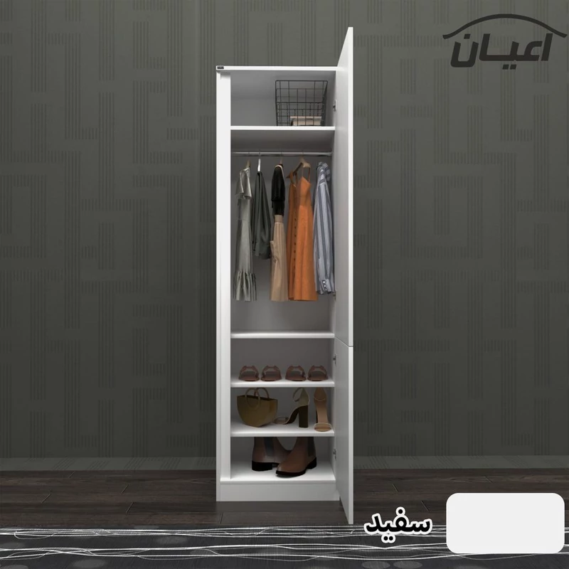 کمد لباس اعیان، جنس نئوپان ملامینه شرکتی شامل دو فضای کمدی، یک درب کمدی دارای میله رگال است بالای میله رگال دارای یک طبقه متحرک می باشد و یک درب کمدی دارای سه طبقه یک طبقه به صورت ثابت و دو طبقه به صورت متحرک می باشد.درب ها به صورت آرام بند می باشد.