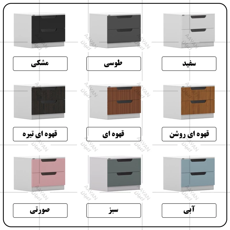 میز پاتختی اعیان ، جنس بدنه کالا : مغزی نئوپان با روکش ملامینه و جنس درب کشوها: مغزی ام دی اف با روکش وکیوم است، دارای دو کشو با بازشوی ریل سه تکه ساچمه ای به همراه دستگیره CNC طراحی شده است ، ارسال به صورت مونتاژ شده است، این کالا را فقط با برند و لوگو اعیان تهیه کنید ، این محصول در رنگ بندی ( سفید، طوسی، مشکی، قهوه ای روشن، قهوه ای(گردویی)، قهوه ای تیره(ونگه)، سبز، آبی و صورتی) تولید و عرضه می شود ، در تمامی رنگ های موجود بدنه ی اصلی کالا سفید می باشد. لطفا توجه فرمایید که همواره چند درجه اختلاف رنگ بین تصاویر بارگذاری شده و کالای ساخته شده وجود دارد.