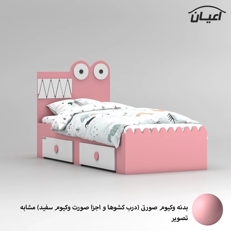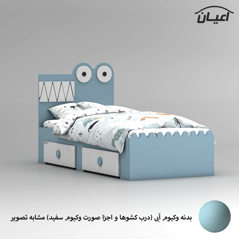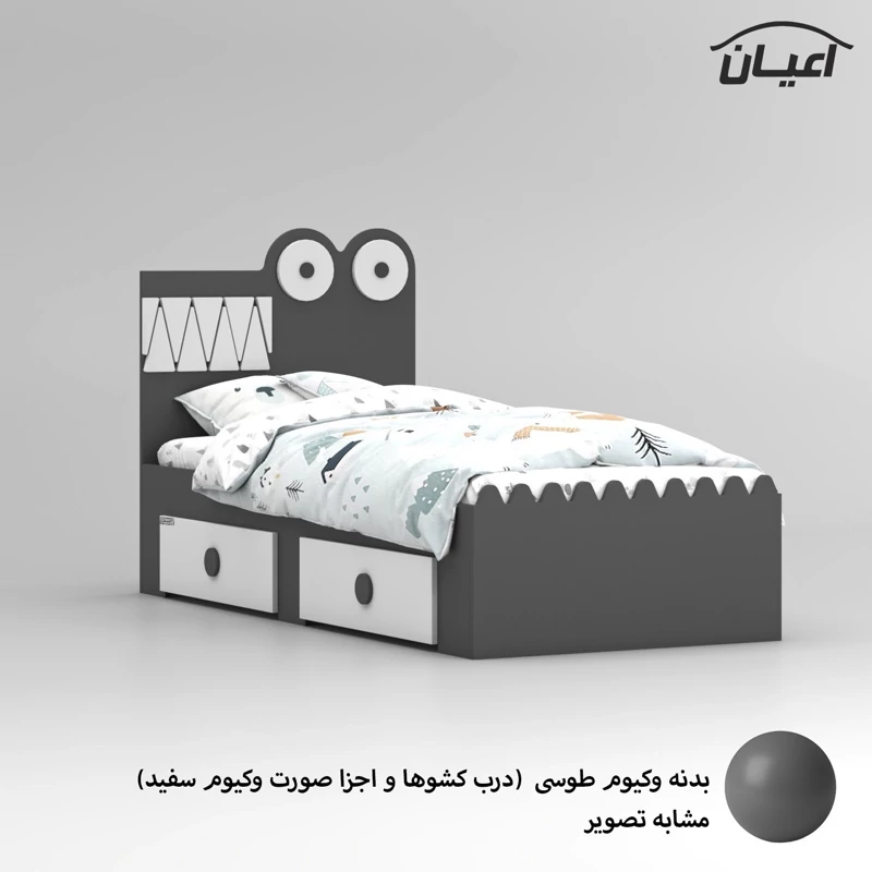 تخت خواب کودک و نوجوان اعیان ، جنس کلی کالا ام دی اف با روکش وکیوم و جنس کلاف داخلی کشوها نئوپان ملامینه ، طراحی ساده ، شیک و کودکانه (به شکل تمساح) ، دارای دو کشو استاندارد با بازشوی چرخ چمدانی (چرخ ساکی) ، ارسال کالا به صورت مونتاژ نشده صورت می گیرد و نیاز به نصب دارد ، کالا فاقد تشک می باشد ، کفی نئوپان و به صورت دو تکه به همراه چند جفت پایه متحرک است ، سایز تشک مناسب برای تخت خواب(180×80 سانتی متر) است، این کالا با رنگ بندی (سفید ، طوسی ، مشکی ، قهوه ای روشن ، قهوه ای (گردویی) ، قهوه ای تیره (ونگه) ، سبز ، آبی و صورتی) تولید و عرضه می شود. دقت کنید که در تمامی رنگ ها درب کشوها و اجزای متصل به کلگی بالا به رنگ سفید می باشد ، این کالا را فقط با لوگو و برند اعیان تهیه کنید، لطفا توجه داشته باشید که همواره چند درجه اختلاف رنگ بین تصاویر بارگذاری شده و کالای ساخته شده وجود دارد.