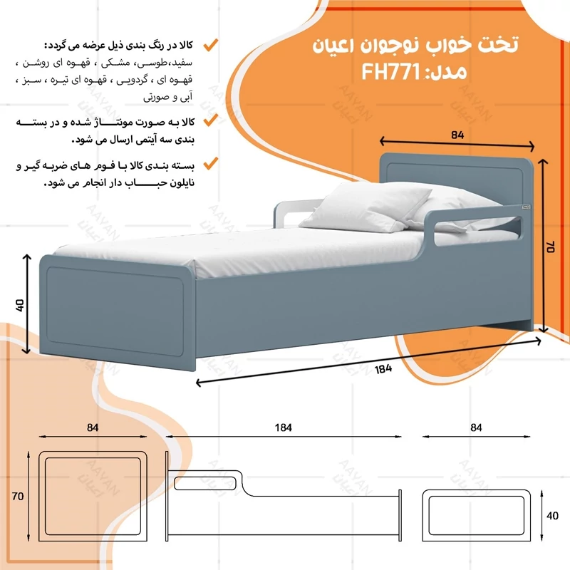 تخت خواب نوجوان اعیان ، جنس : مغزی ام دی اف با روکش وکیوم ، طرحی ساده ، شیک و ترکیب با طراحی CNC ، کالا فاقد تشک می باشد ،کفی به صورت دوتکه به همراه چند جفت پایه متحرک است، سایز تشک مناسب برای تخت خواب (180×80 سانتی متر) ، این کالا با رنگ بندی (سفید ، طوسی ، مشکی ، قهوه ای روشن ، قهوه ای (گردویی) ، قهوه ای تیره (ونگه) ، سبز ، آبی ، صورتی و حالت چند رنگ (سفید، سبز) ) تولید و عرضه می شود ، این کالا را فقط با لوگو و برند اعیان تهیه کنید، لطفا توجه داشته باشید که همواره چند درجه اختلاف رنگ بین تصاویر بارگذاری شده و کالای ساخته شده وجود دارد.