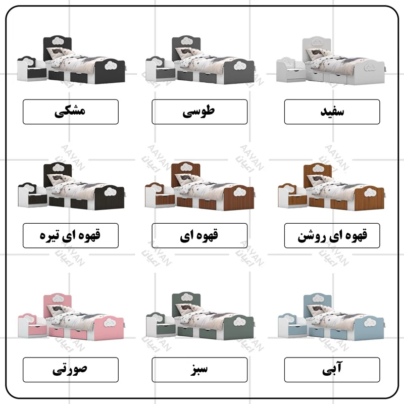 ست تخت خواب و پاتختی نوجوان اعیان تخت خواب کودک و نوجوان اعیان طرح ابر ، جنس : مغزی ام دی اف با روکش وکیوم ، جنس بغل تخت ها : مغزی نئوپان با روکش ملامینه ،دارای دو کشو با بازشوی چرخ چمدانی(ساکی) ، ارسال به صورت مونتاژ نشده است و دارای کفی دوتکه نئوپان می باشد که همراه با چند جفت پایه ارسال می گردد.