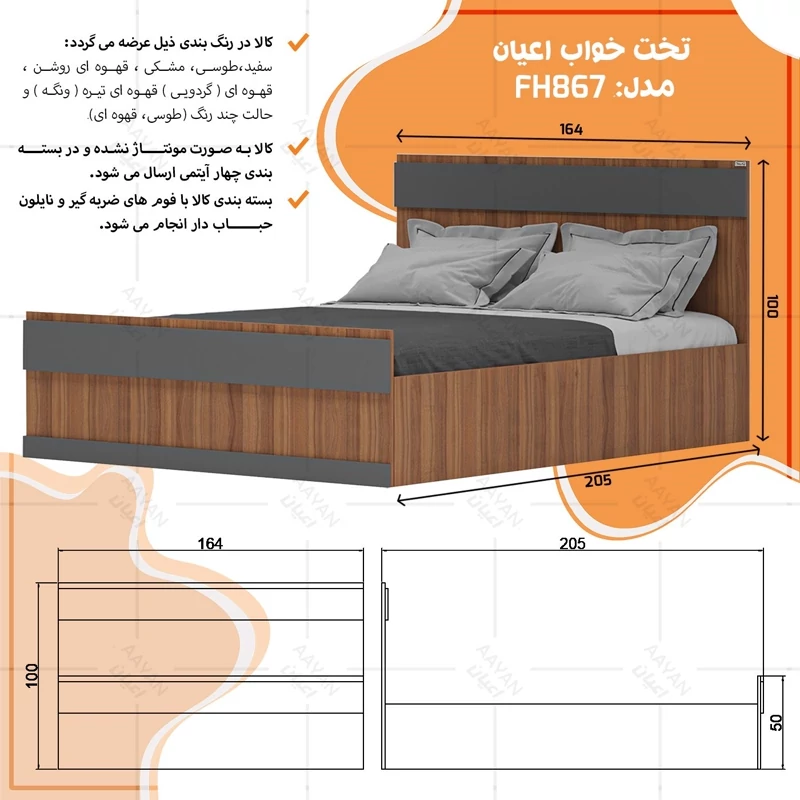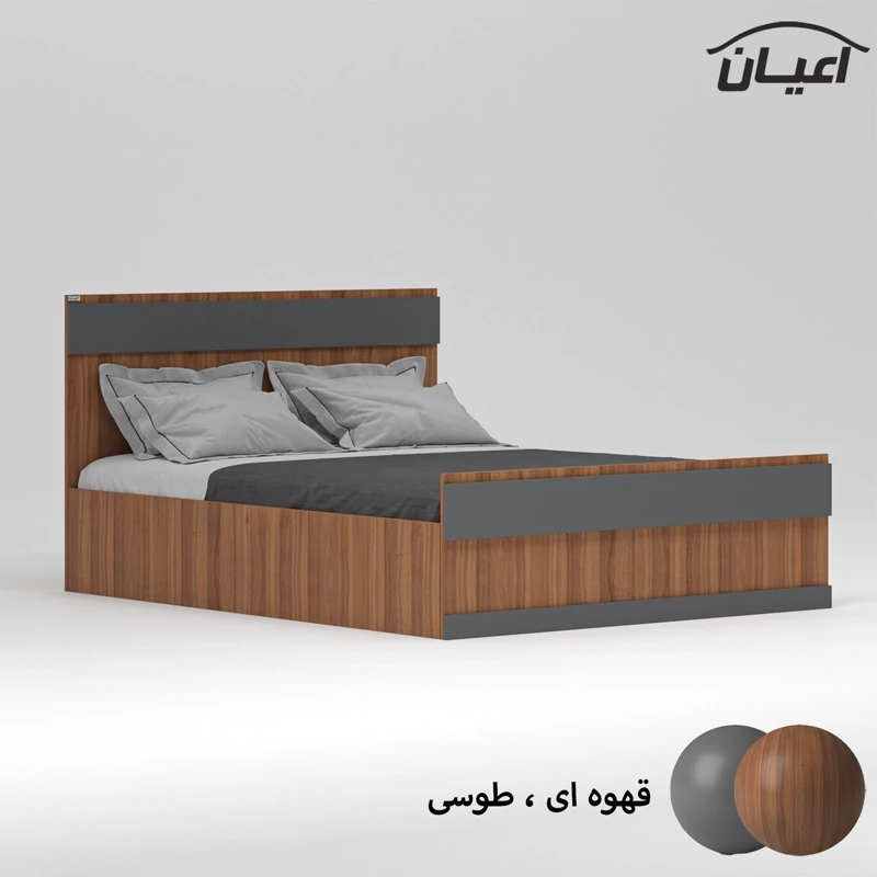 تخت خواب دو نفره اعیان ، جنس : مغزی نئوپان با روکش ملامینه ، قسمت کلگی بالا و پایین تخت نوار های دوبل از جنس ملامینه کار شده است ، کفی کار به صورت سه تکه و از جنس نئوپان می باشد ، کالا فاقد تشک است و بایستی تشک 200×160سانت تهیه نمایید. این کالا در رنگ بندی :(سفید ، طوسی ، مشکی ، قهوه ای روشن ، قهوه ای (گردویی) ، قهوه ای تیره (ونگه) و حالت چند رنگ (قهوه ای ، طوسی) تولید و عرضه می گردد ، این کالا را فقط با لوگو و برند اعیان تهیه کنید ، لطفا توجه فرمایید که همواره چند درجه اختلاف رنگ بین تصاویر بارگزاری شده و کالای ساخته شده وجود دارد.