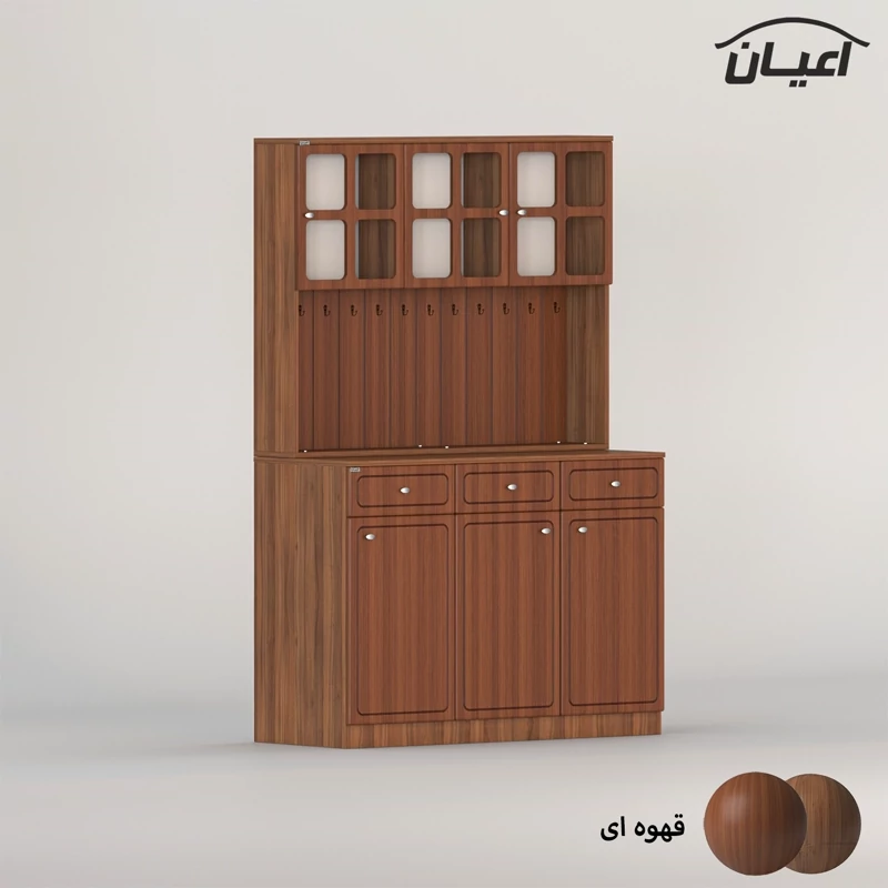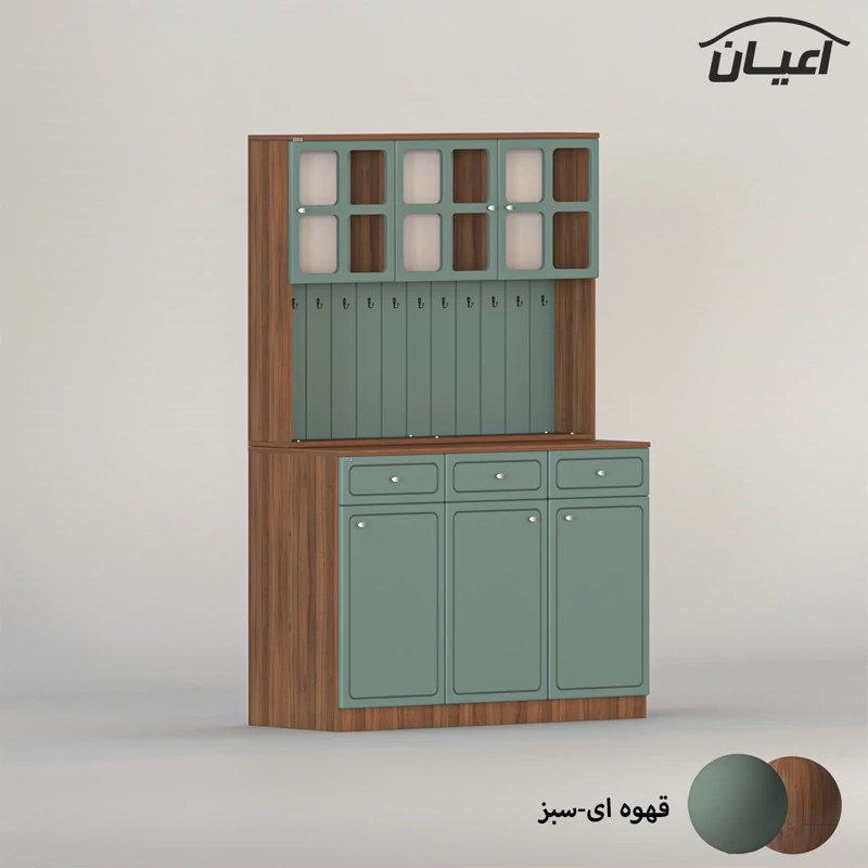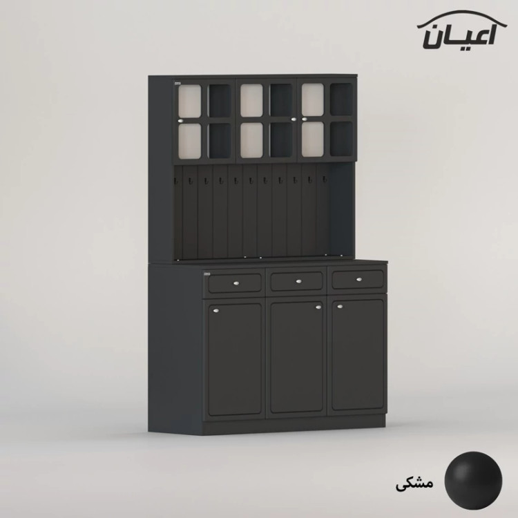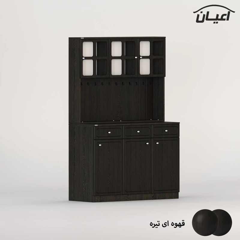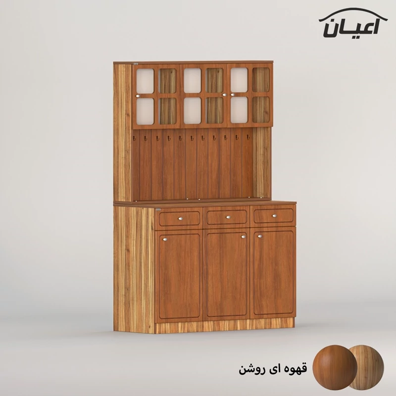 در قسمت بالا سه بخش کمدی ویترینی با یک طبقه و دو فضا قرار داده شده است که دارای طراحی مدرن و خاص می باشد. دستگیره های کار به صورت تک پیچ و از جنس استیل می باشد، محصول دارای 11 عدد آویز لیوان کوچک در نمای کار است، این کالا را فقط با لوگو و برند اعیان تهیه کنید.