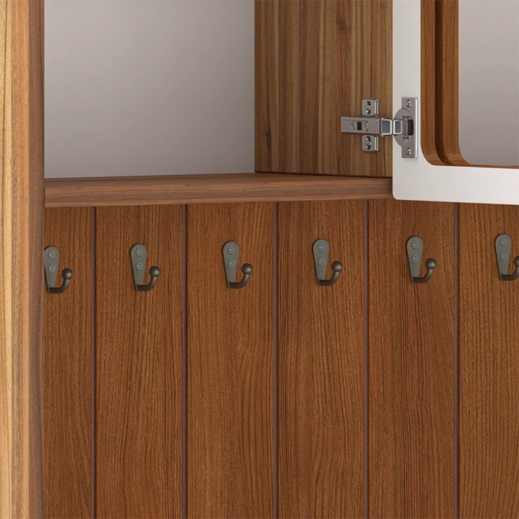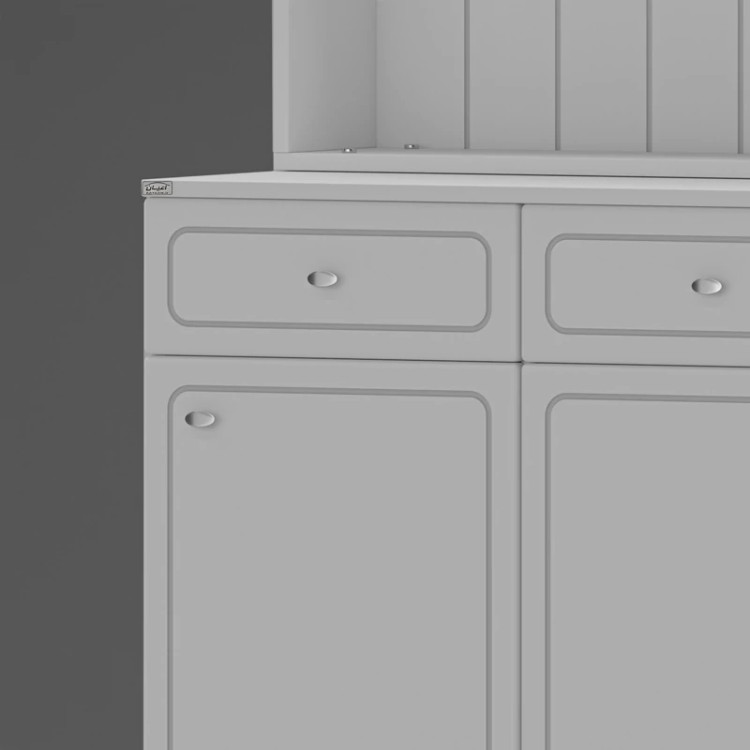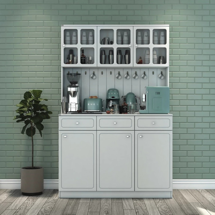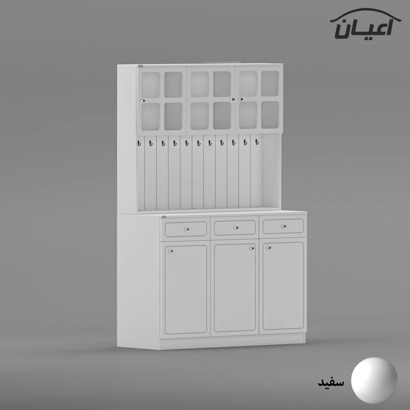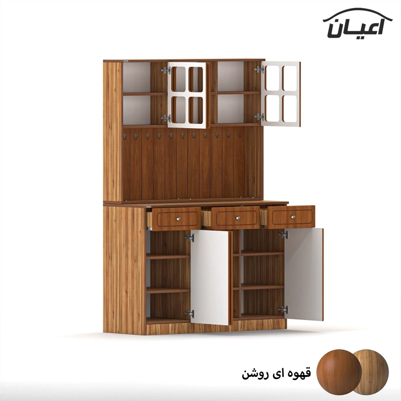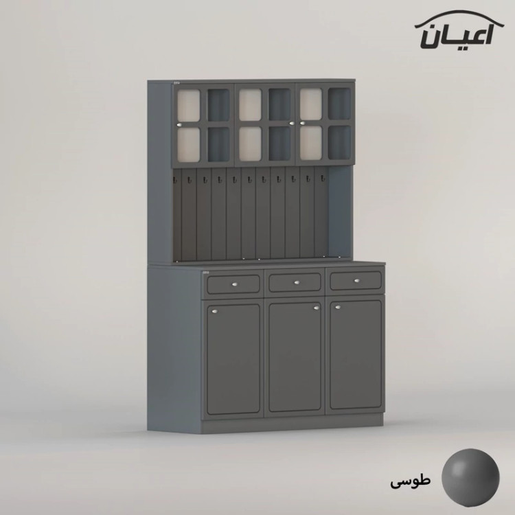 در قسمت بالا سه بخش کمدی ویترینی با یک طبقه و دو فضا قرار داده شده است که دارای طراحی مدرن و خاص می باشد. دستگیره های کار به صورت تک پیچ و از جنس استیل می باشد، محصول دارای 11 عدد آویز لیوان کوچک در نمای کار است، این کالا را فقط با لوگو و برند اعیان تهیه کنید.