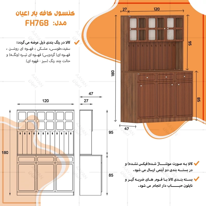 کنسول کافه بار اعیان ، جنس بدنه مغزی نئوپان با روکش ملامینه ، جنس درب ها و نمای کار مغزی ام دی اف با روکش وکیوم و دارای طرح CNC، کالا به صورت دو تکه و فیکس نشده ارسال می شود ، قسمت پایین کار دارای یک میز کار ، سه کشو با بازشوی ریل سه تکه ساچمه ای و با سه درب کمدی می باشد که هر سمت دارای دو طبقه و سه فضا است ،